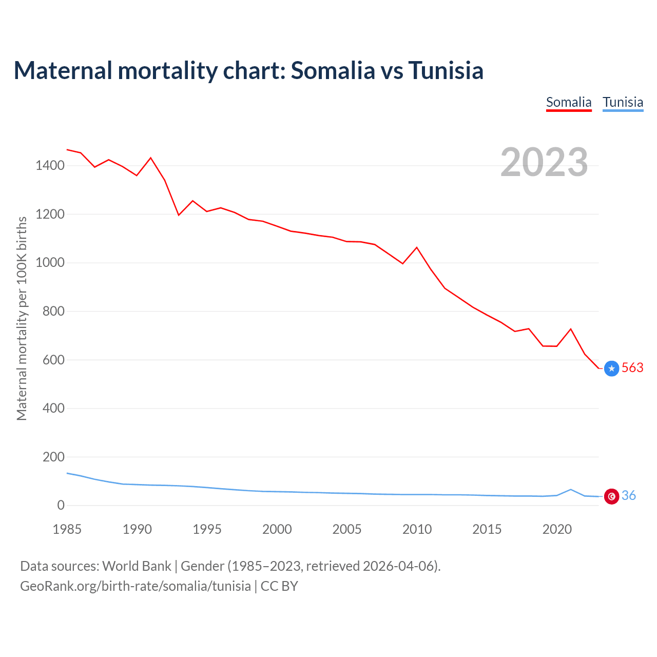 The maternal mortality rate, which is the probability of dying during childbirth or within 42 days of pregnancy termination, is 563 deaths per 100,000 live births in Somalia, compared to 36 deaths in Tunisia.