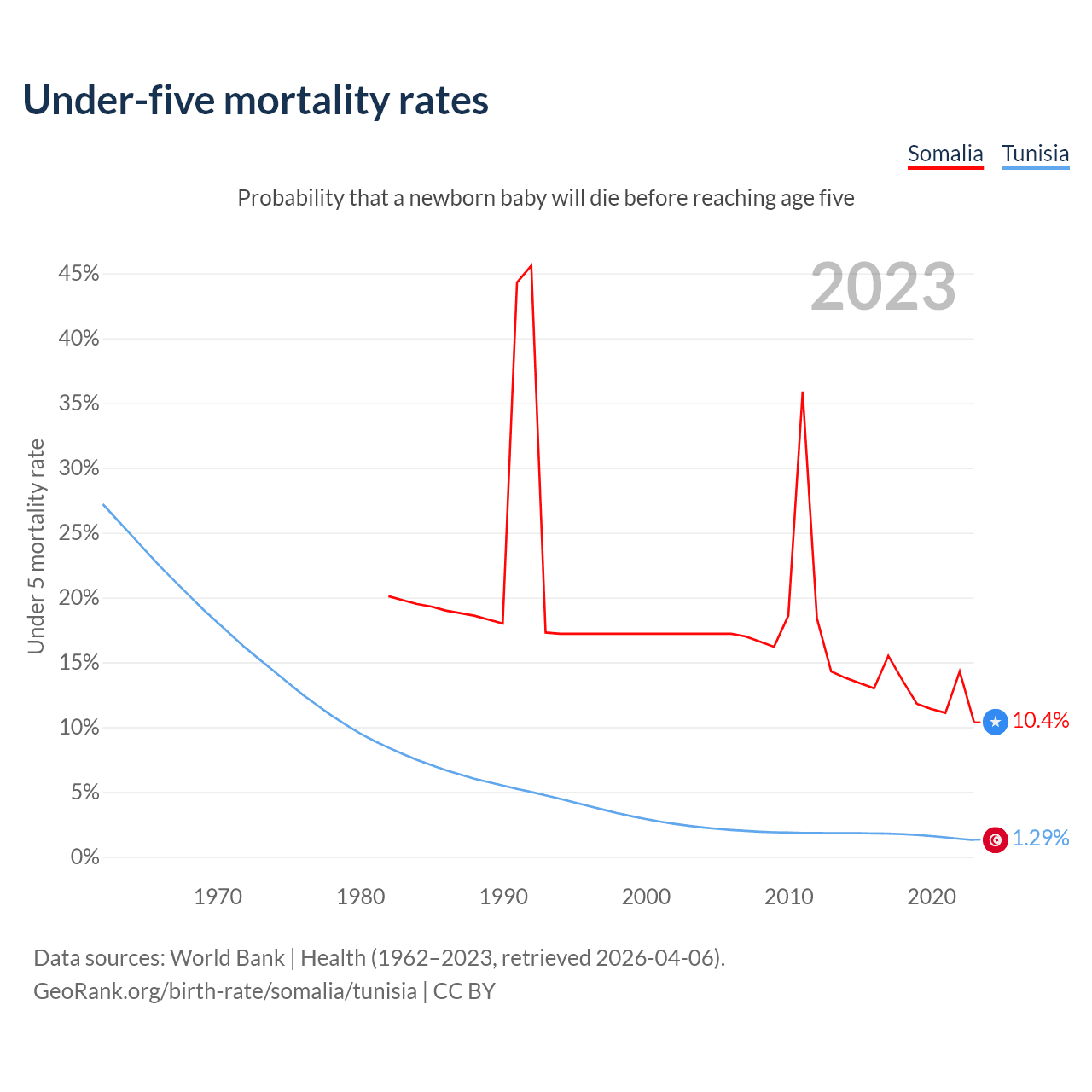 The chance that a newborn baby will die before reaching age five is 10.4% in Somalia and 1.29% in Tunisia. Above is a chart with historical data on under-five mortality rates.