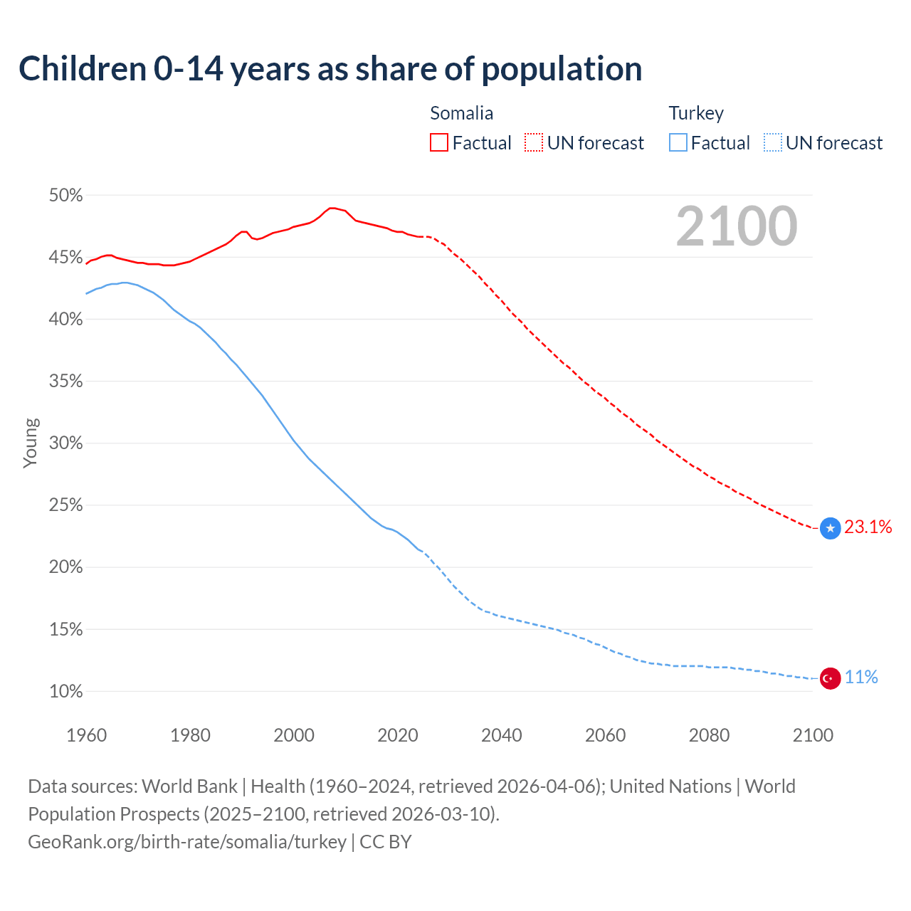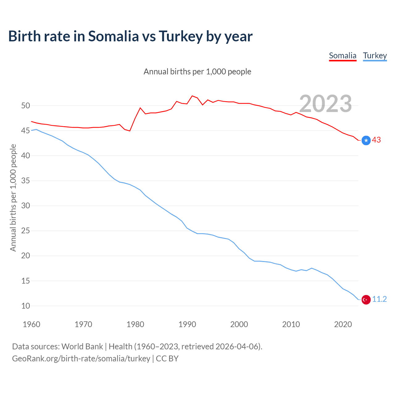 Somalia has an annual birth rate of 43 births per 1,000 people, compared to 11.2 for Turkey. The average number of children a woman is expected to have during her lifetime — the fertility rate, is 6.13 in Somalia and 1.51 in Turkey — 75.4% difference.