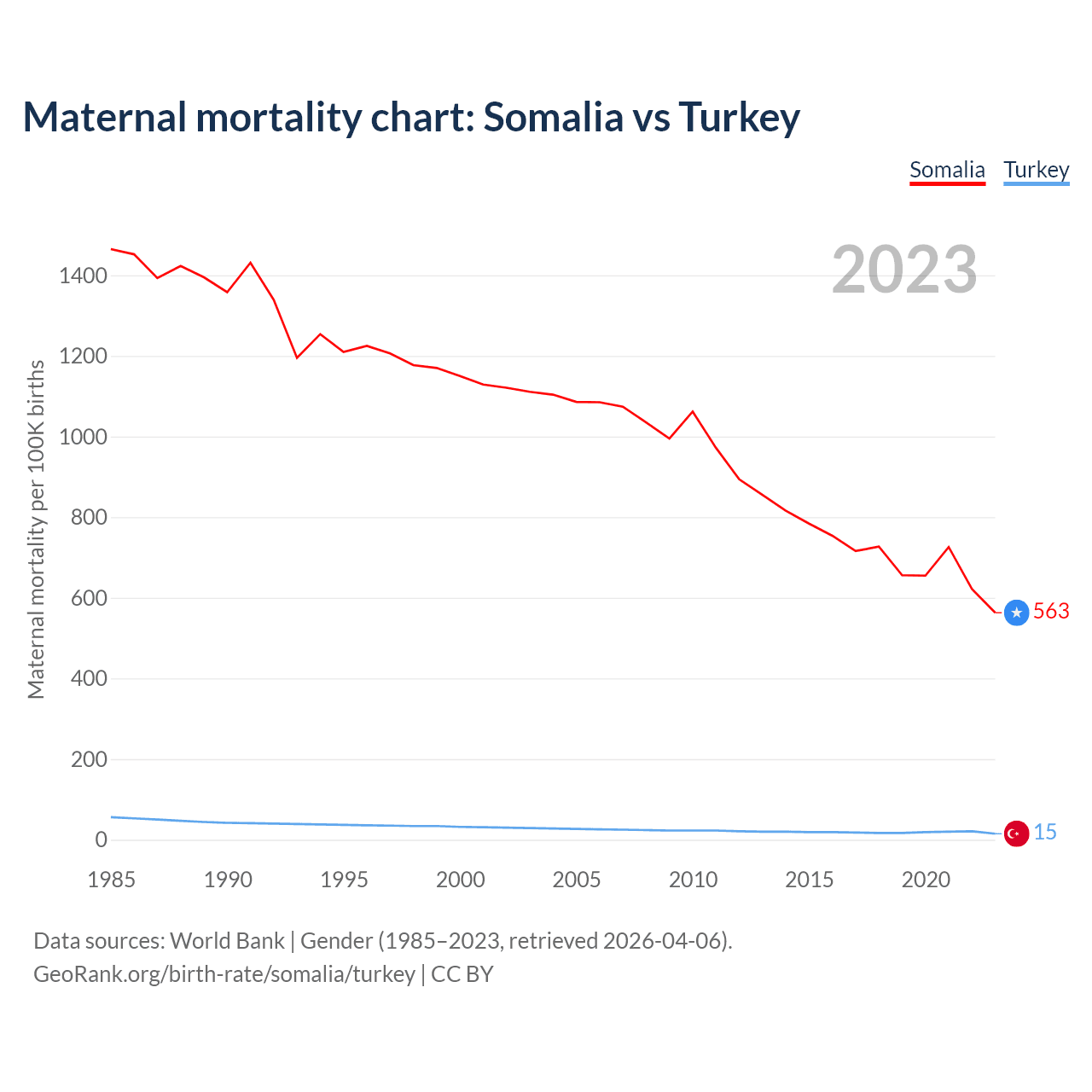 The maternal mortality rate, which is the probability of dying during childbirth or within 42 days of pregnancy termination, is 563 deaths per 100,000 live births in Somalia, compared to 15 deaths in Turkey.