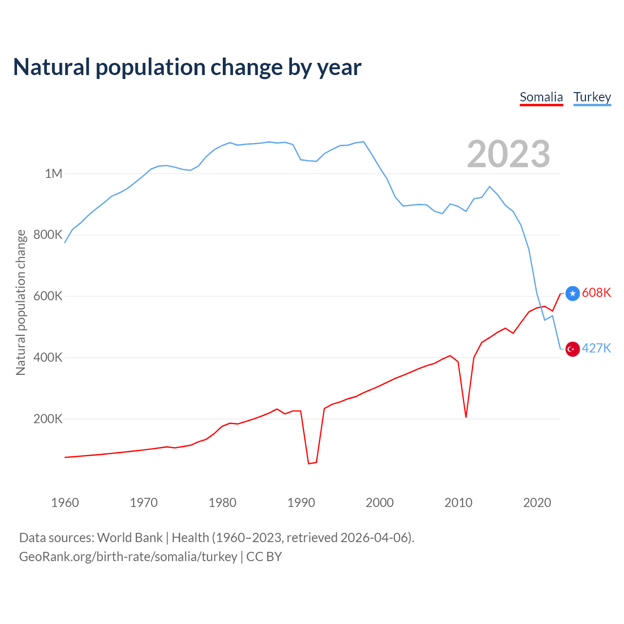 According to the latest available data on birth rates, the fertility rate in Somalia was 6.13 children per woman in 2023, compared to 1.51 in Turkey in 2023. The replacement level is considered to be 2.1 children per woman.