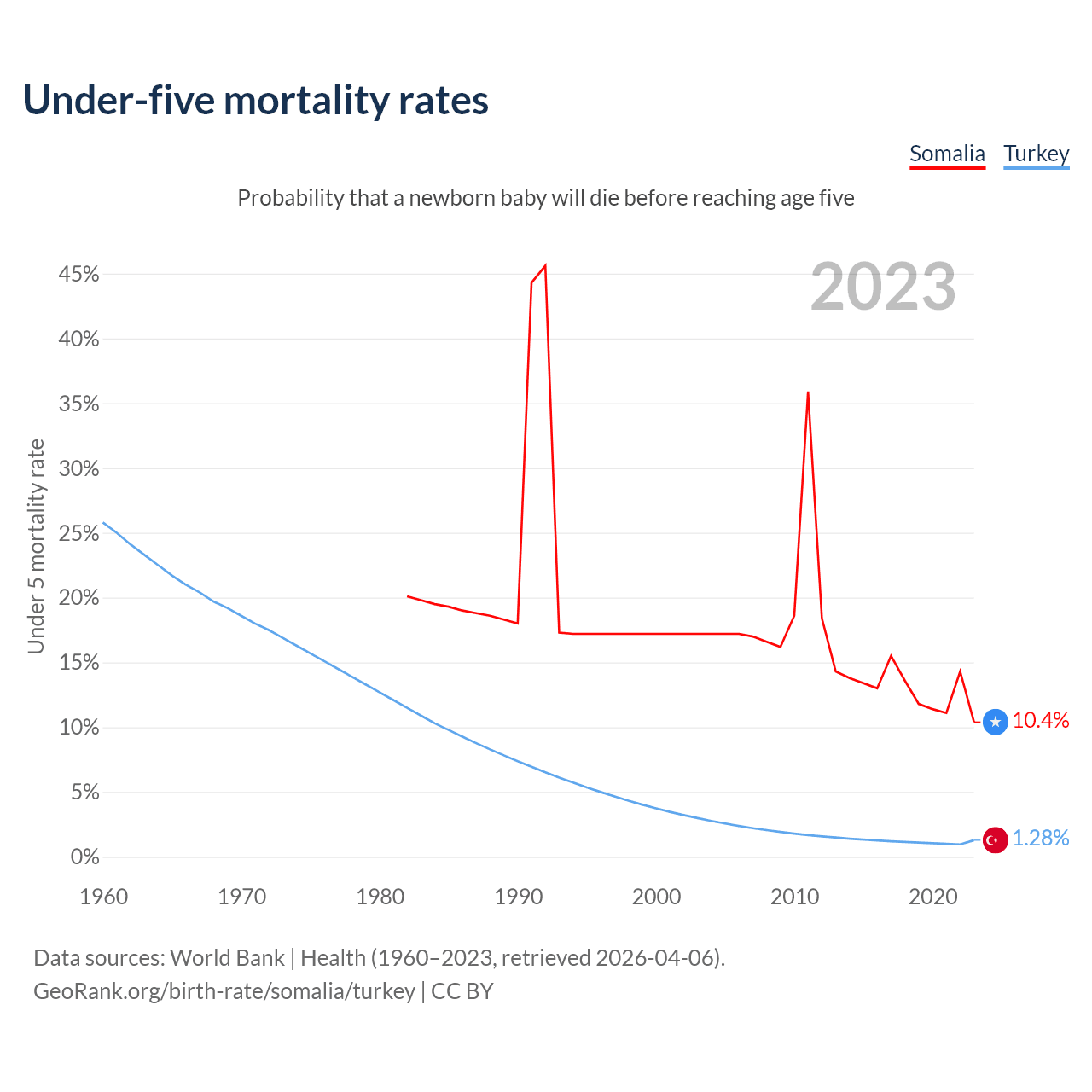The chance that a newborn baby will die before reaching age five is 10.4% in Somalia and 1.28% in Turkey. Above is a chart with historical data on under-five mortality rates.