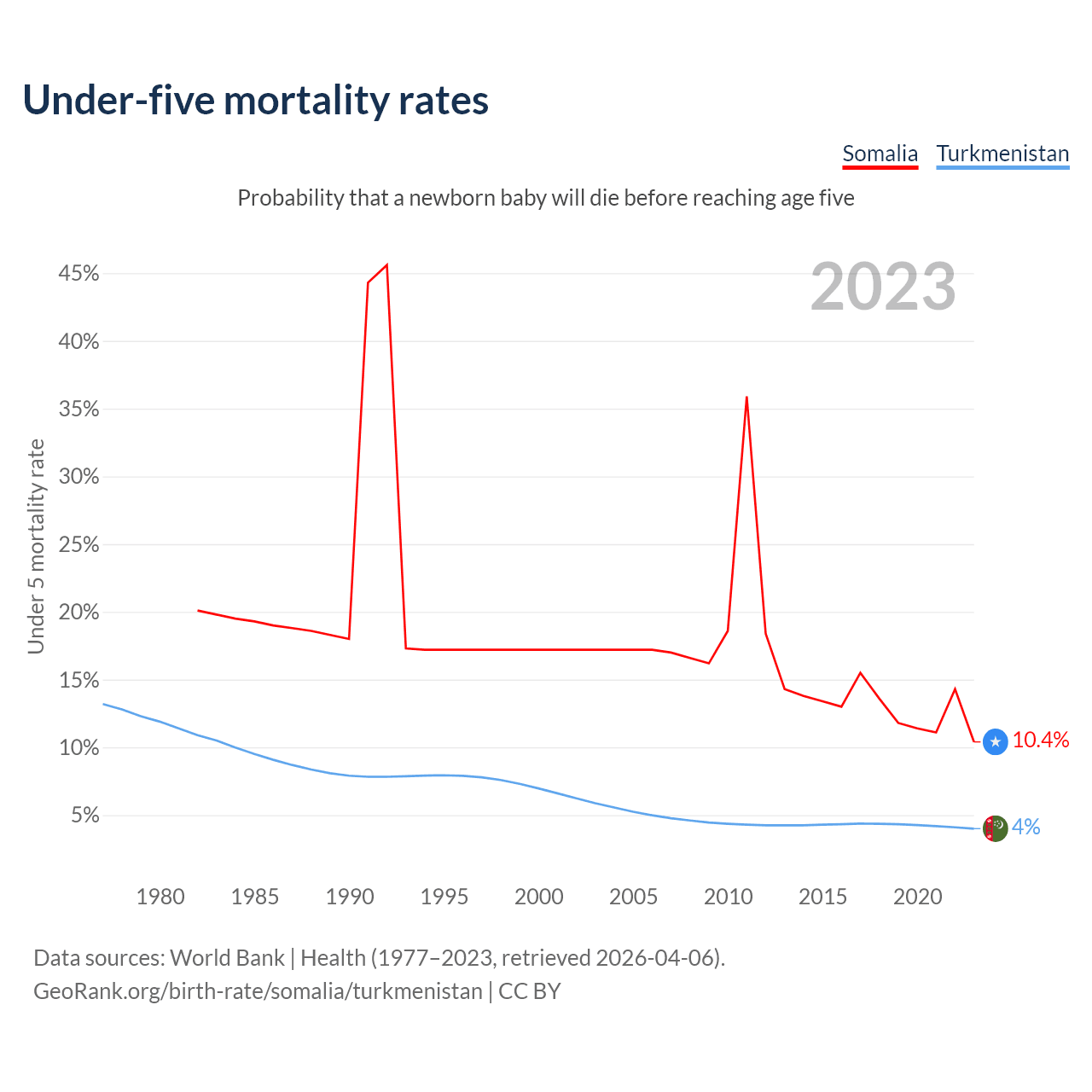 The chance that a newborn baby will die before reaching age five is 10.4% in Somalia and 4% in Turkmenistan. Above is a chart with historical data on under-five mortality rates.