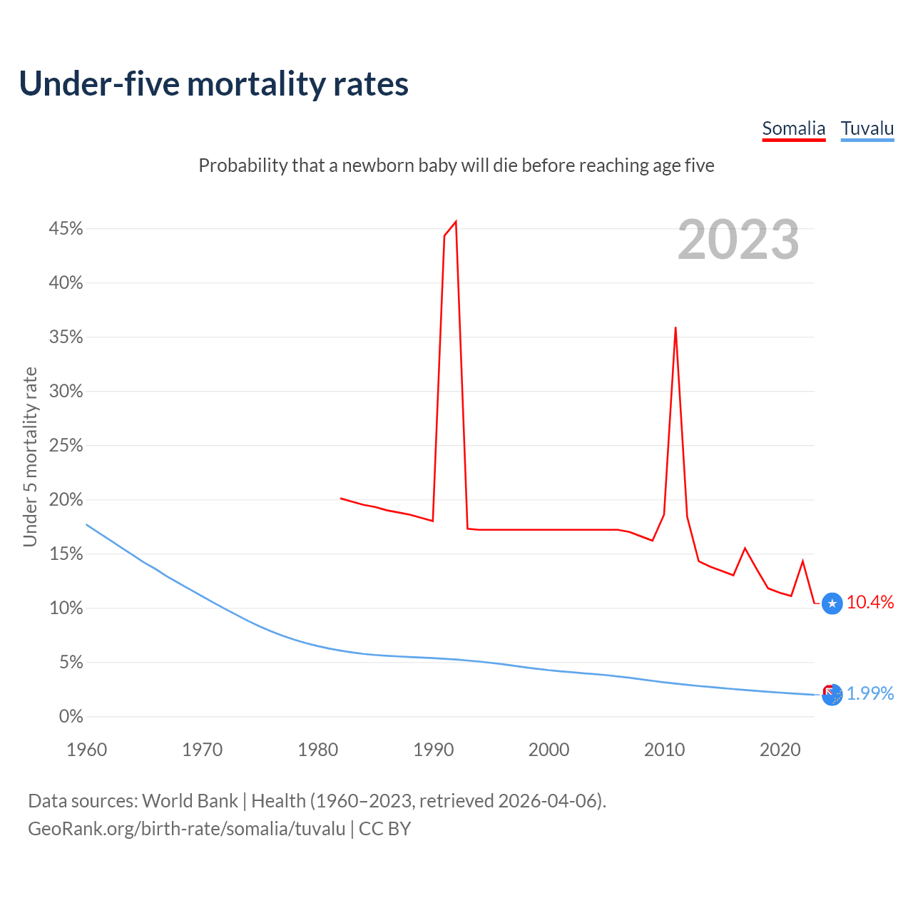 The chance that a newborn baby will die before reaching age five is 10.4% in Somalia and 1.99% in Tuvalu. Above is a chart with historical data on under-five mortality rates.