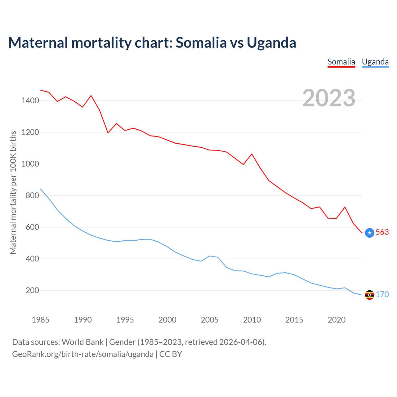The maternal mortality rate, which is the probability of dying during childbirth or within 42 days of pregnancy termination, is 563 deaths per 100,000 live births in Somalia, compared to 170 deaths in Uganda.