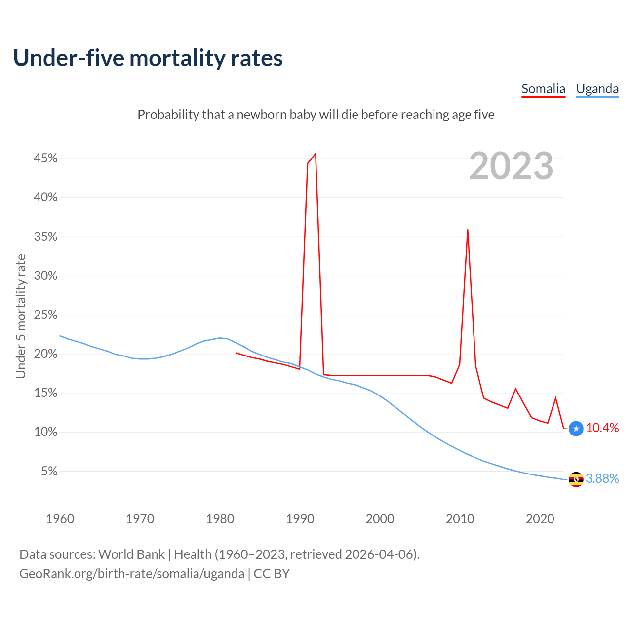 The chance that a newborn baby will die before reaching age five is 10.4% in Somalia and 3.88% in Uganda. Above is a chart with historical data on under-five mortality rates.