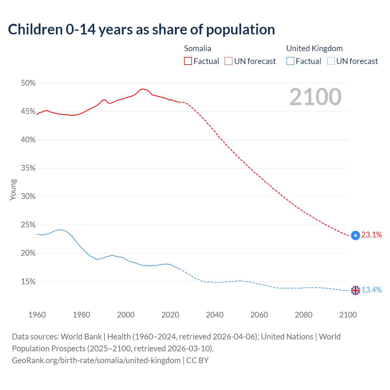 Somalia has an annual birth rate of 43 births per 1,000 people, compared to 10 for the United Kingdom. The average number of children a woman is expected to have during her lifetime — the fertility rate, is 6.13 in Somalia and 1.56 in the United Kingdom — 74.6% difference.