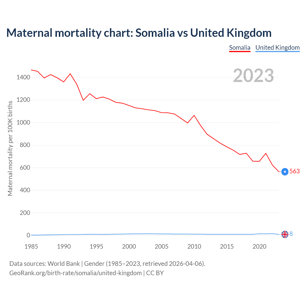 The maternal mortality rate, which is the probability of dying during childbirth or within 42 days of pregnancy termination, is 563 deaths per 100,000 live births in Somalia, compared to 8 deaths in the United Kingdom.