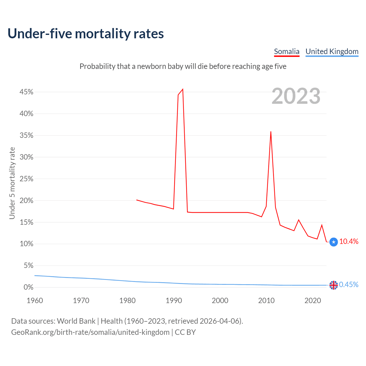 The chance that a newborn baby will die before reaching age five is 10.4% in Somalia and 0.45% in the United Kingdom. Above is a chart with historical data on under-five mortality rates.