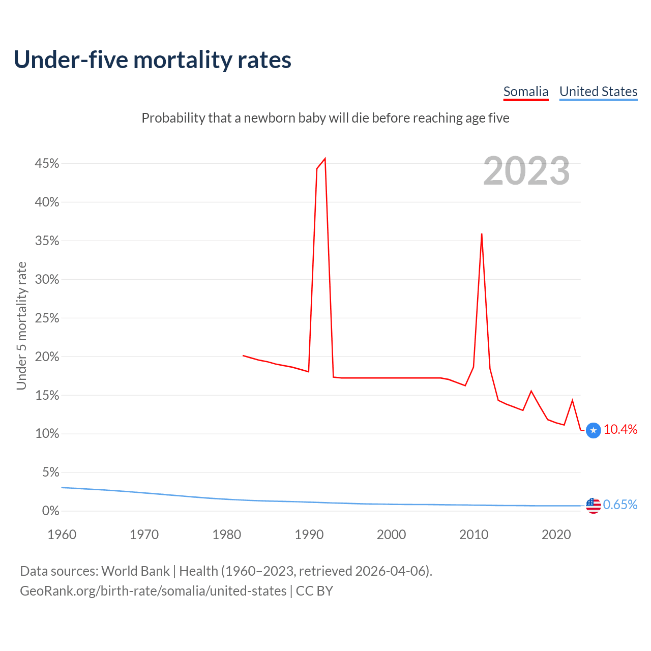 The chance that a newborn baby will die before reaching age five is 10.4% in Somalia and 0.65% in the United States. Above is a chart with historical data on under-five mortality rates.