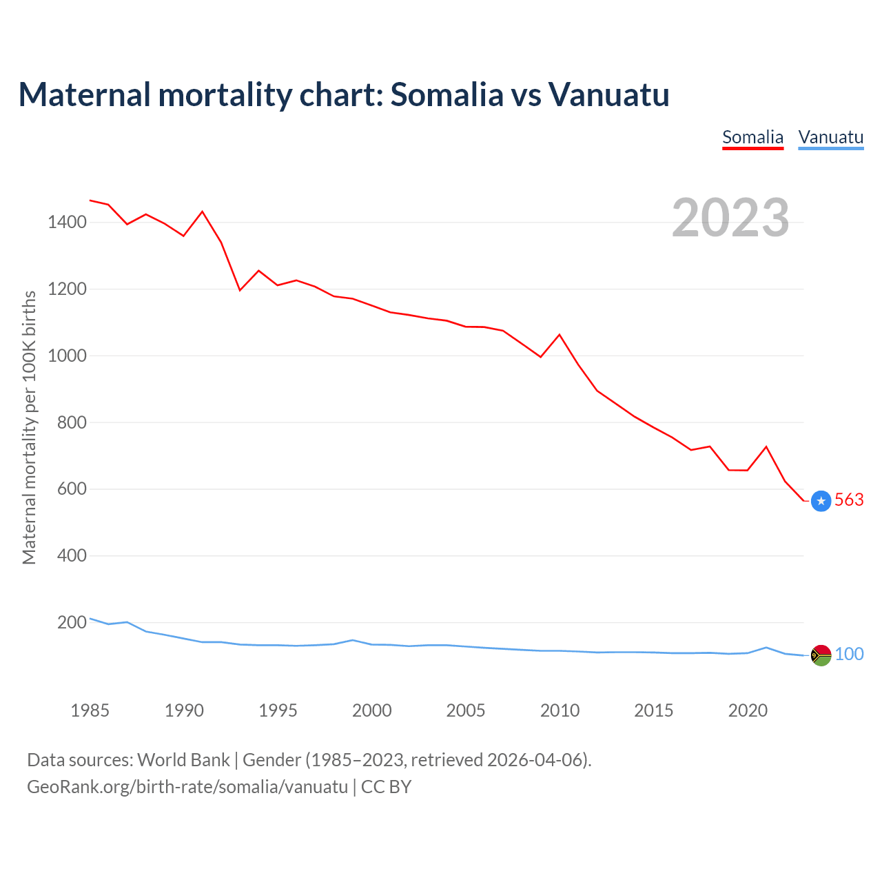 The maternal mortality rate, which is the probability of dying during childbirth or within 42 days of pregnancy termination, is 563 deaths per 100,000 live births in Somalia, compared to 100 deaths in Vanuatu.
