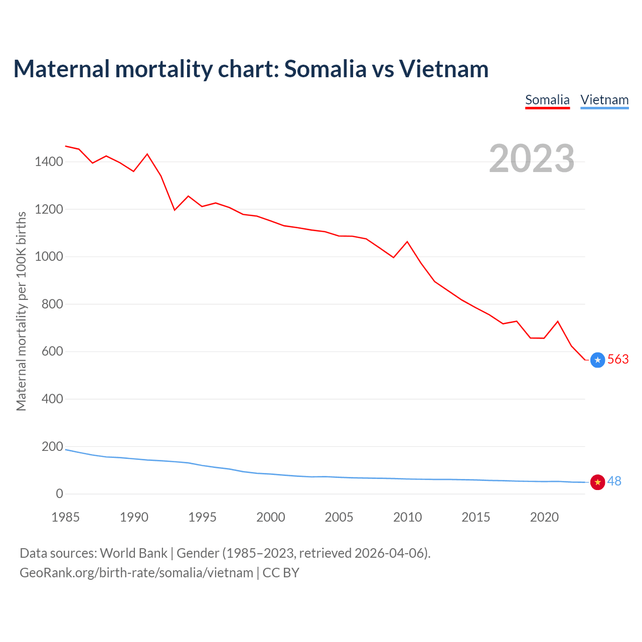 The maternal mortality rate, which is the probability of dying during childbirth or within 42 days of pregnancy termination, is 563 deaths per 100,000 live births in Somalia, compared to 48 deaths in Vietnam.
