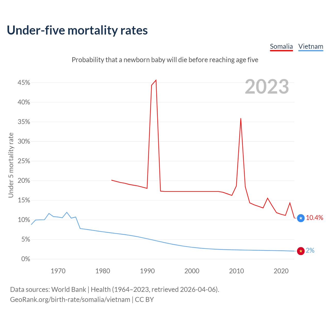 The chance that a newborn baby will die before reaching age five is 10.4% in Somalia and 2% in Vietnam. Above is a chart with historical data on under-five mortality rates.