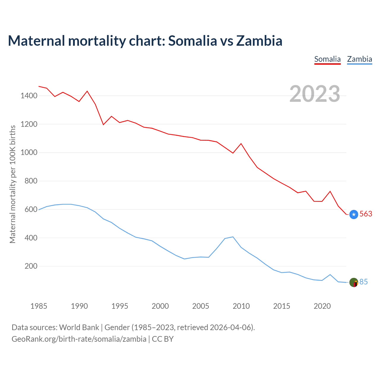 The maternal mortality rate, which is the probability of dying during childbirth or within 42 days of pregnancy termination, is 563 deaths per 100,000 live births in Somalia, compared to 85 deaths in Zambia.