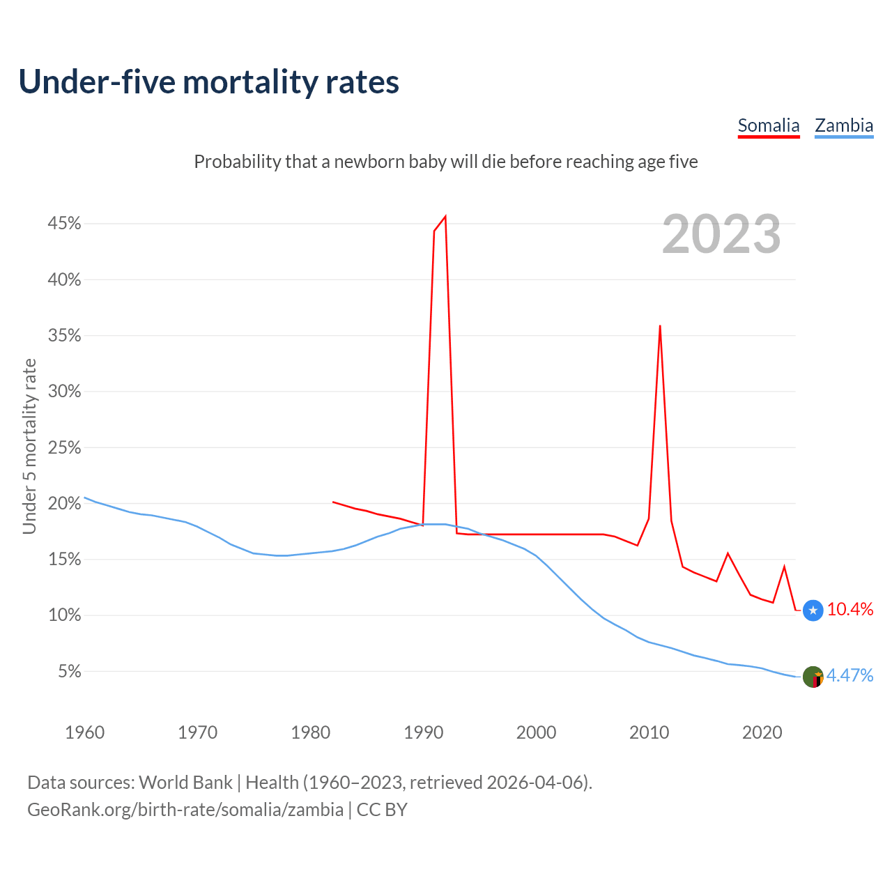 The chance that a newborn baby will die before reaching age five is 10.4% in Somalia and 4.47% in Zambia. Above is a chart with historical data on under-five mortality rates.