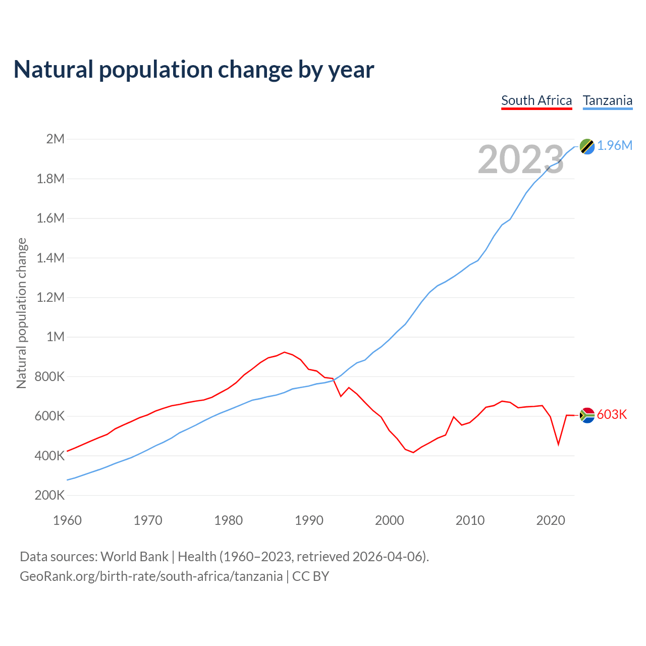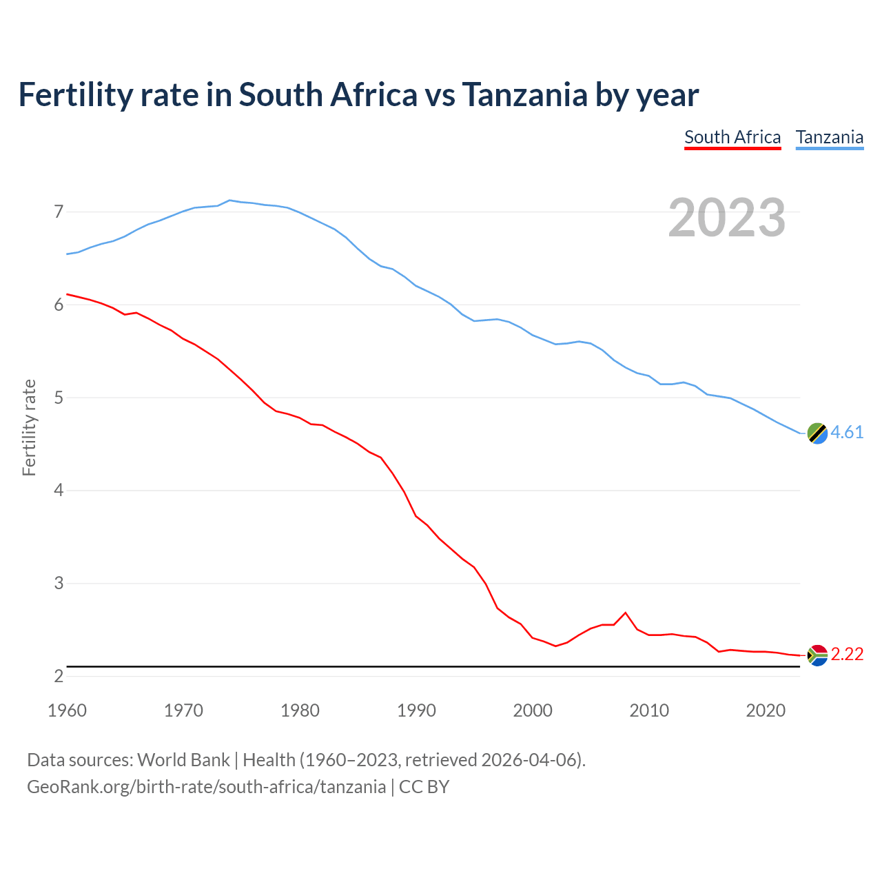 According to the latest available data on birth rates, the fertility rate in South Africa was 2.22 children per woman in 2023, compared to 4.61 in Tanzania in 2023. The replacement level is considered to be 2.1 children per woman.