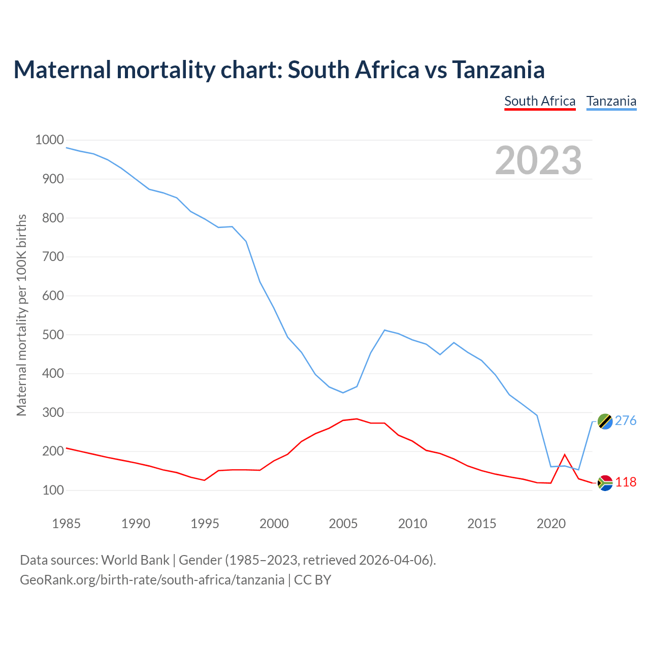The maternal mortality rate, which is the probability of dying during childbirth or within 42 days of pregnancy termination, is 118 deaths per 100,000 live births in South Africa, compared to 276 deaths in Tanzania.