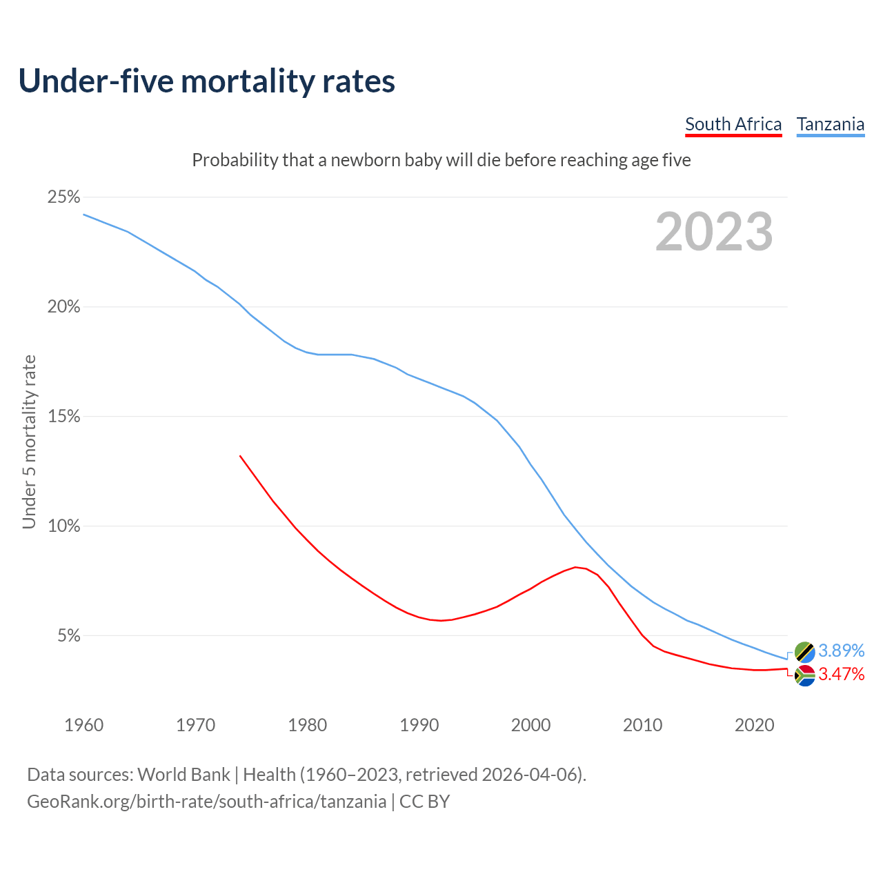 The chance that a newborn baby will die before reaching age five is 3.47% in South Africa and 3.89% in Tanzania. Above is a chart with historical data on under-five mortality rates.