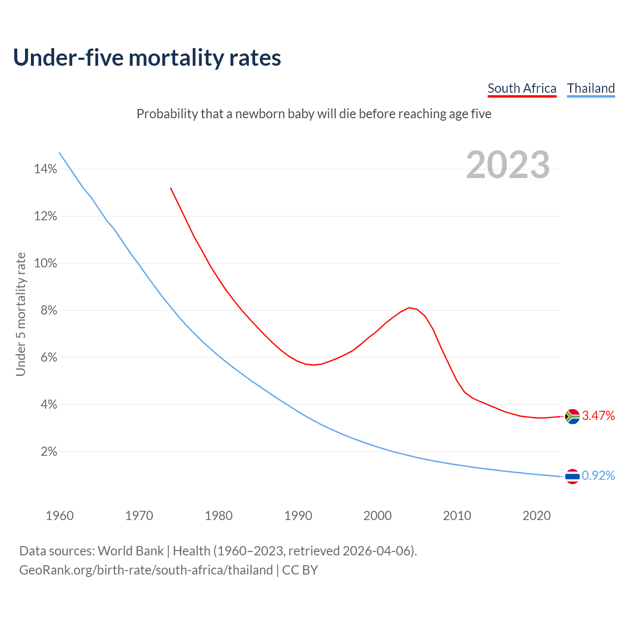The chance that a newborn baby will die before reaching age five is 3.47% in South Africa and 0.92% in Thailand. Above is a chart with historical data on under-five mortality rates.