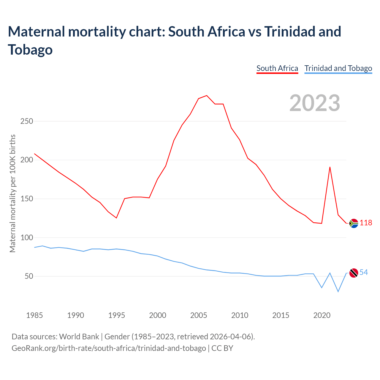 The maternal mortality rate, which is the probability of dying during childbirth or within 42 days of pregnancy termination, is 118 deaths per 100,000 live births in South Africa, compared to 54 deaths in Trinidad and Tobago.