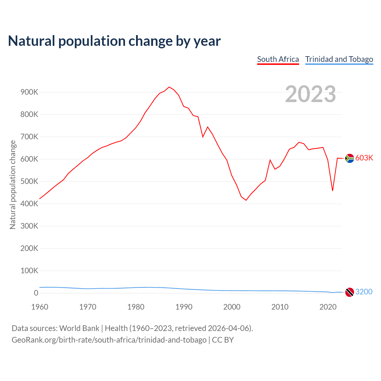 South Africa has an annual birth rate of 18.8 births per 1,000 people, compared to 10.7 for Trinidad and Tobago. The average number of children a woman is expected to have during her lifetime — the fertility rate, is 2.22 in South Africa and 1.53 in Trinidad and Tobago — 30.9% difference.