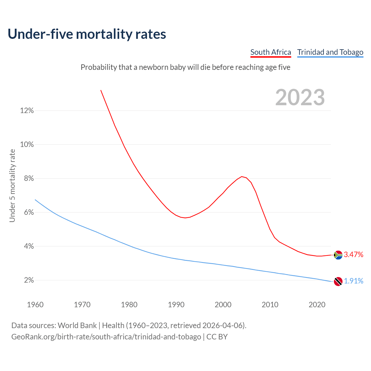 The chance that a newborn baby will die before reaching age five is 3.47% in South Africa and 1.91% in Trinidad and Tobago. Above is a chart with historical data on under-five mortality rates.