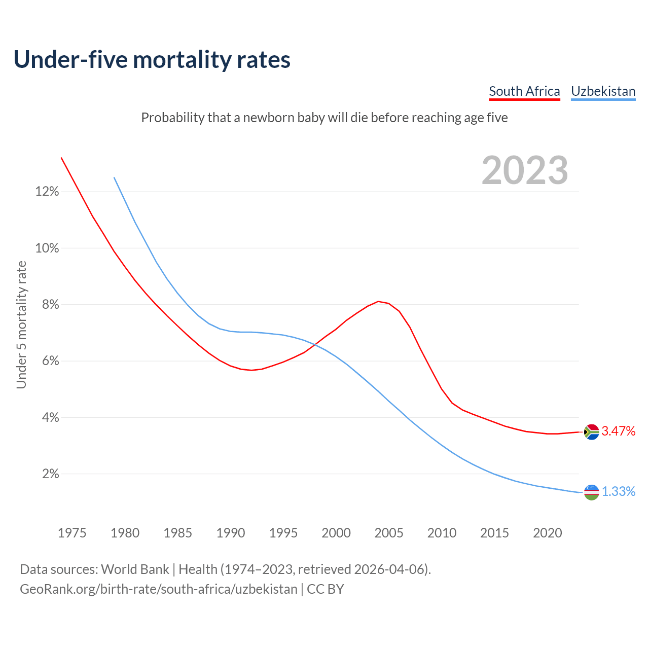 The chance that a newborn baby will die before reaching age five is 3.47% in South Africa and 1.33% in Uzbekistan. Above is a chart with historical data on under-five mortality rates.