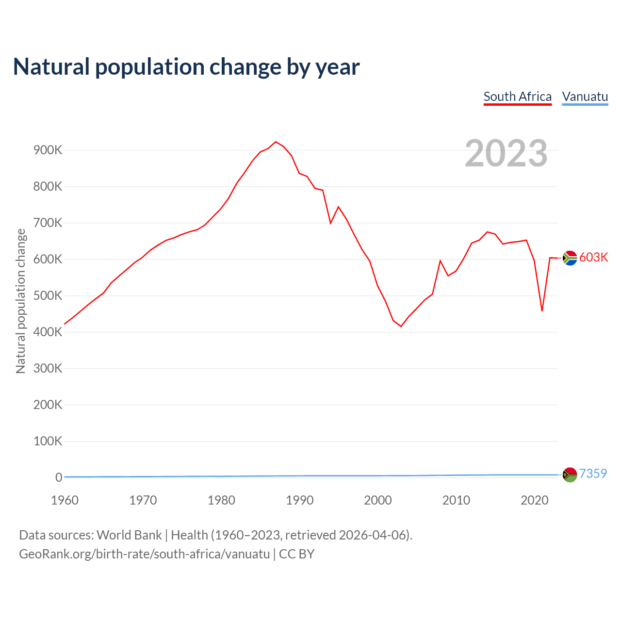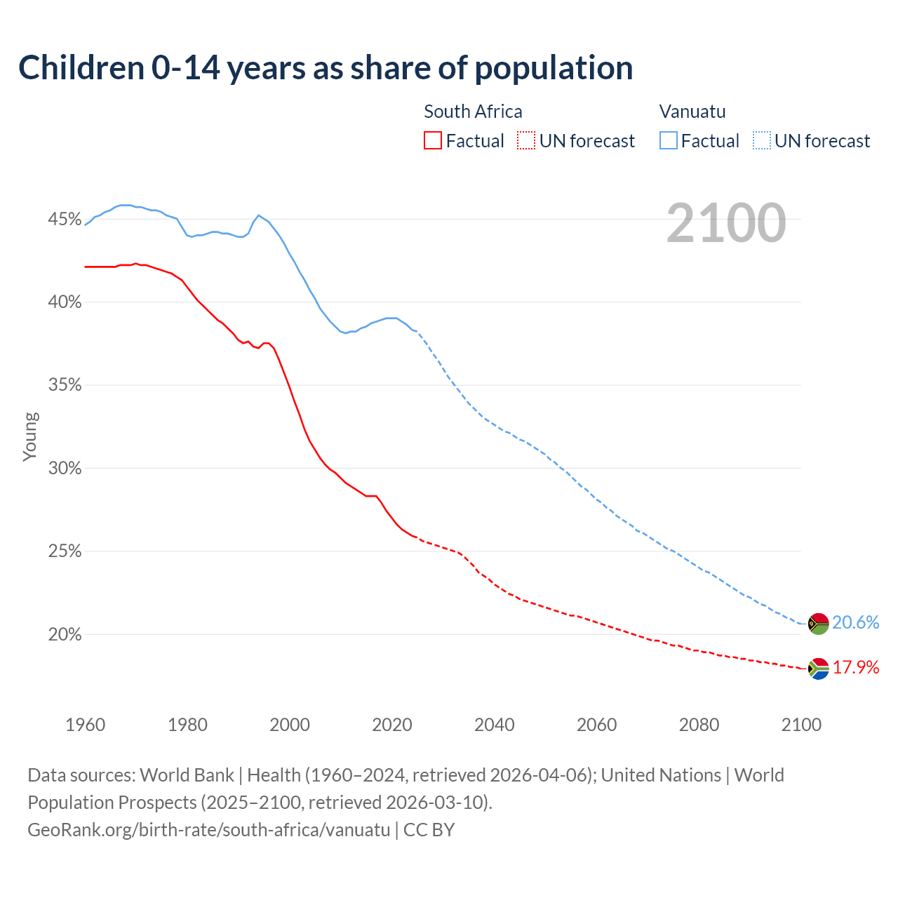 According to the latest available data on birth rates, the fertility rate in South Africa was 2.22 children per woman in 2023, compared to 3.6 in Vanuatu in 2023. The replacement level is considered to be 2.1 children per woman.