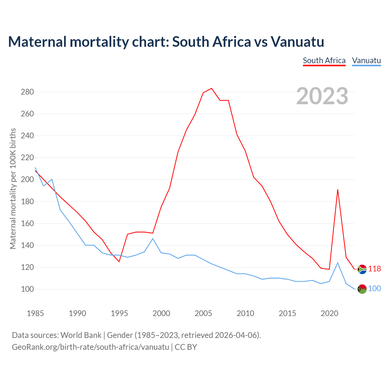 The maternal mortality rate, which is the probability of dying during childbirth or within 42 days of pregnancy termination, is 118 deaths per 100,000 live births in South Africa, compared to 100 deaths in Vanuatu.