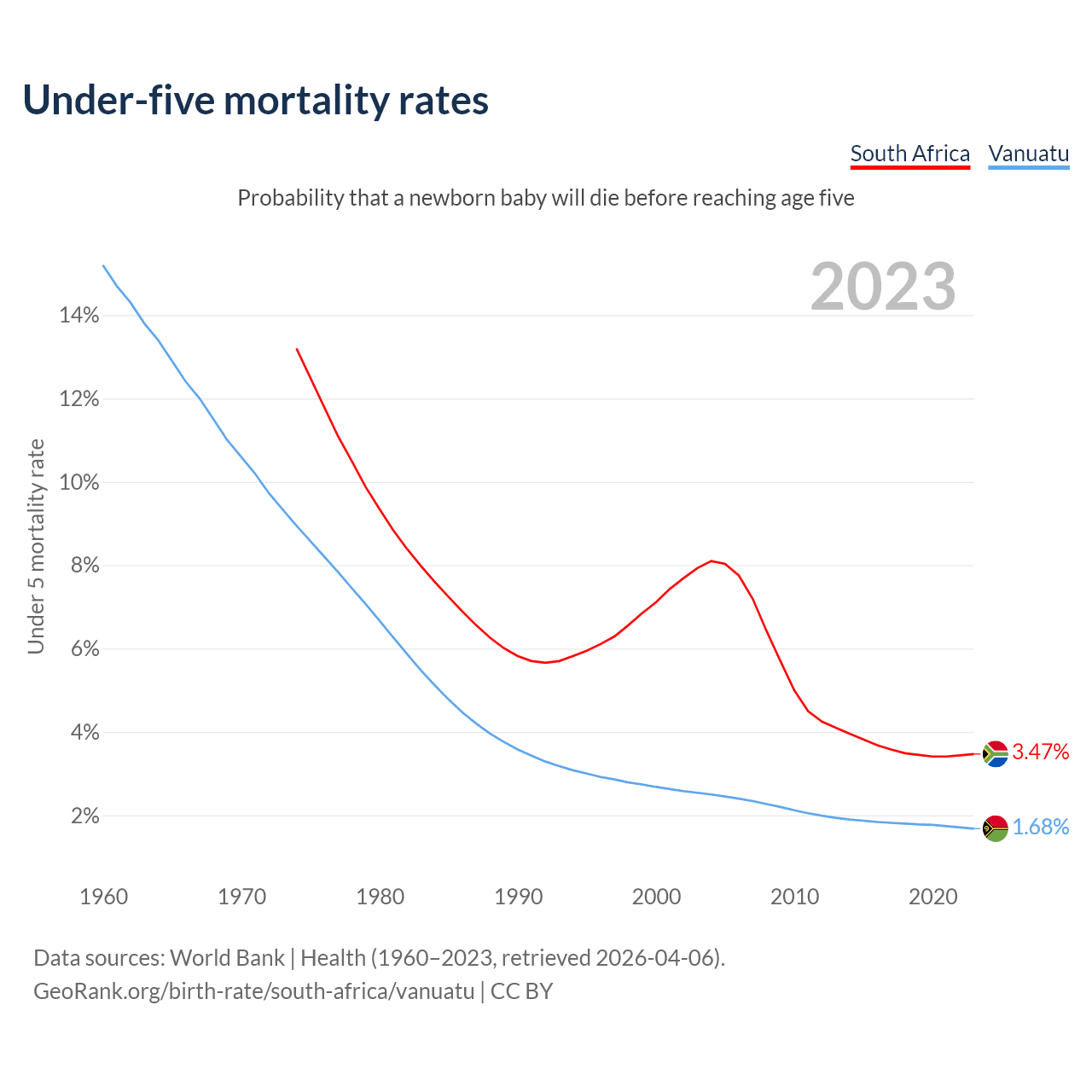 The chance that a newborn baby will die before reaching age five is 3.47% in South Africa and 1.68% in Vanuatu. Above is a chart with historical data on under-five mortality rates.
