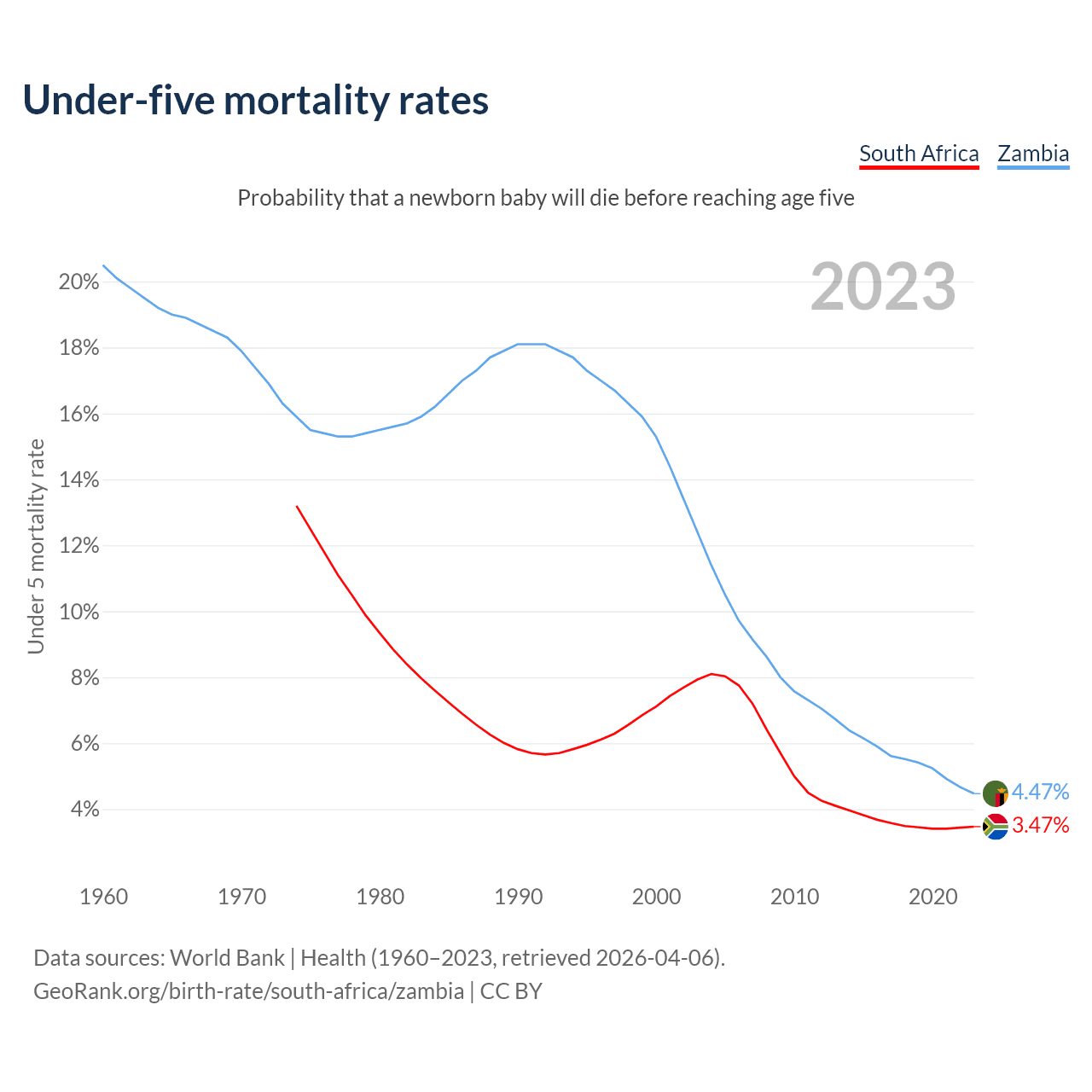 The chance that a newborn baby will die before reaching age five is 3.47% in South Africa and 4.47% in Zambia. Above is a chart with historical data on under-five mortality rates.