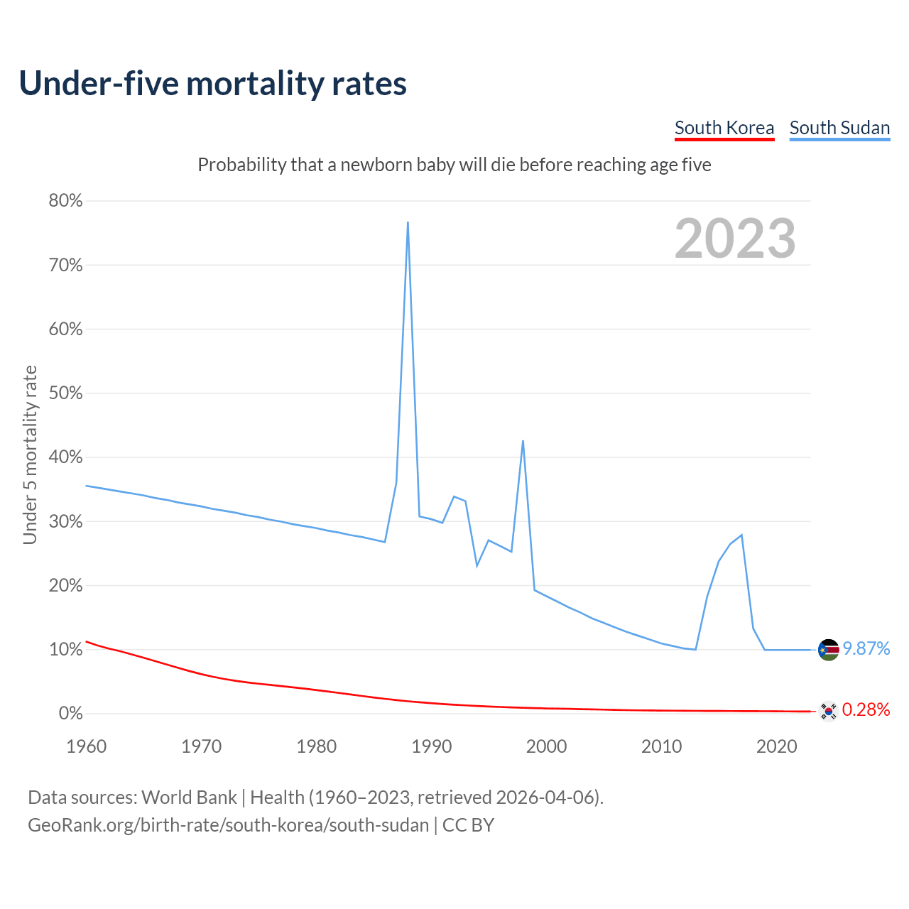 The chance that a newborn baby will die before reaching age five is 0.28% in South Korea and 9.87% in South Sudan. Above is a chart with historical data on under-five mortality rates.