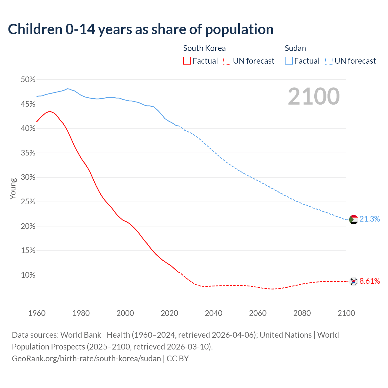 South Korea has an annual birth rate of 4.5 births per 1,000 people, compared to 33.6 for Sudan. The average number of children a woman is expected to have during her lifetime — the fertility rate, is 0.72 in South Korea and 4.32 in Sudan — 500% difference.