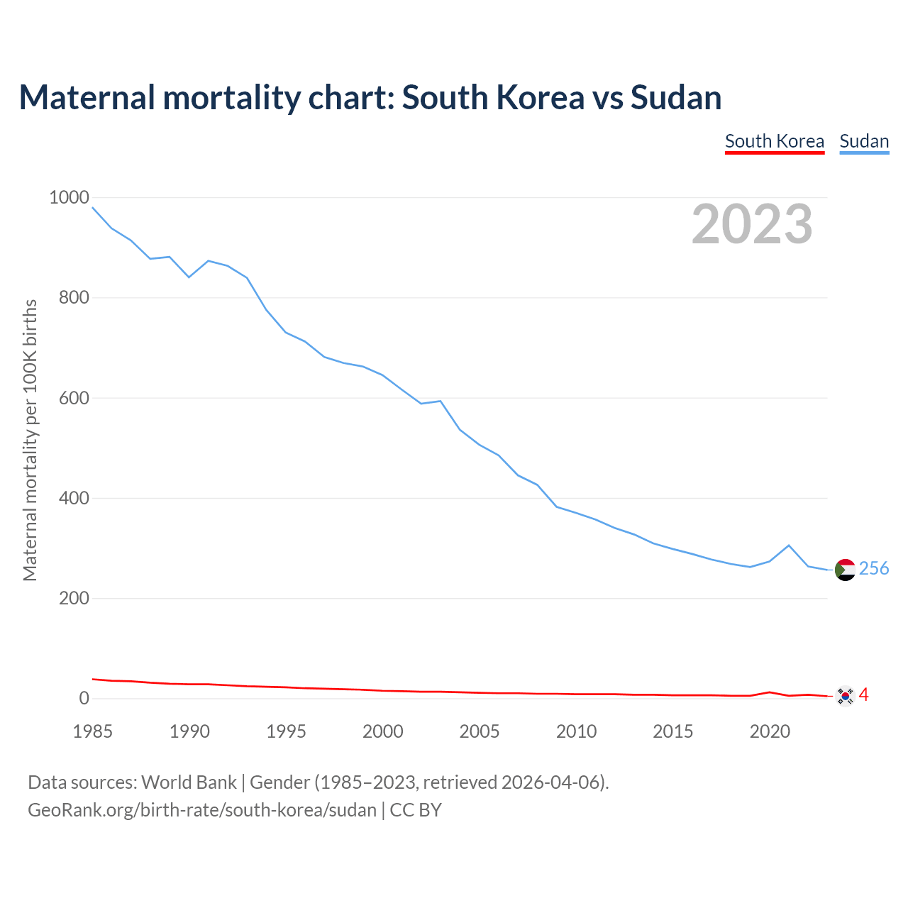 The maternal mortality rate, which is the probability of dying during childbirth or within 42 days of pregnancy termination, is 4 deaths per 100,000 live births in South Korea, compared to 256 deaths in Sudan.
