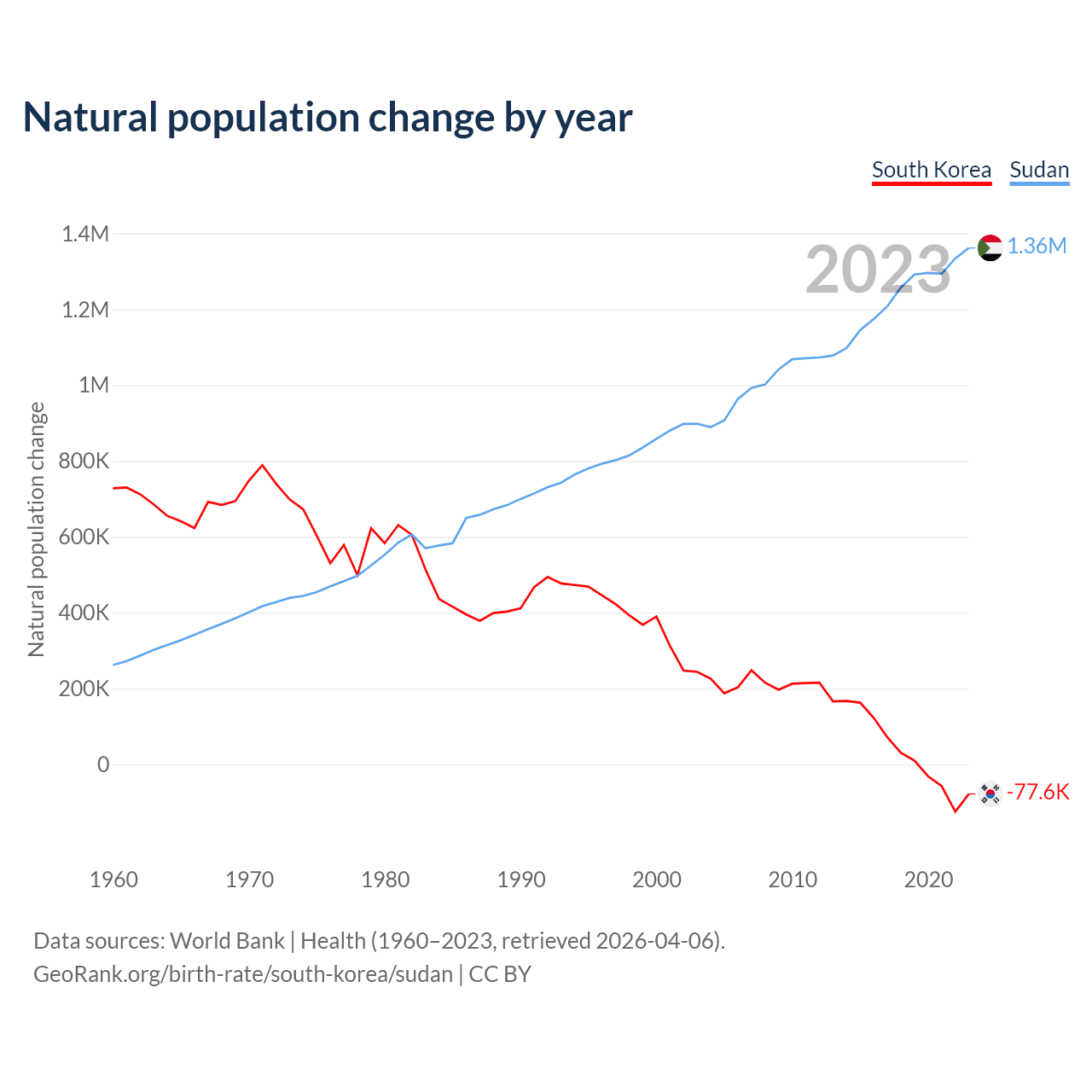 According to the latest available data on birth rates, the fertility rate in South Korea was 0.72 children per woman in 2023, compared to 4.32 in Sudan in 2023. The replacement level is considered to be 2.1 children per woman.