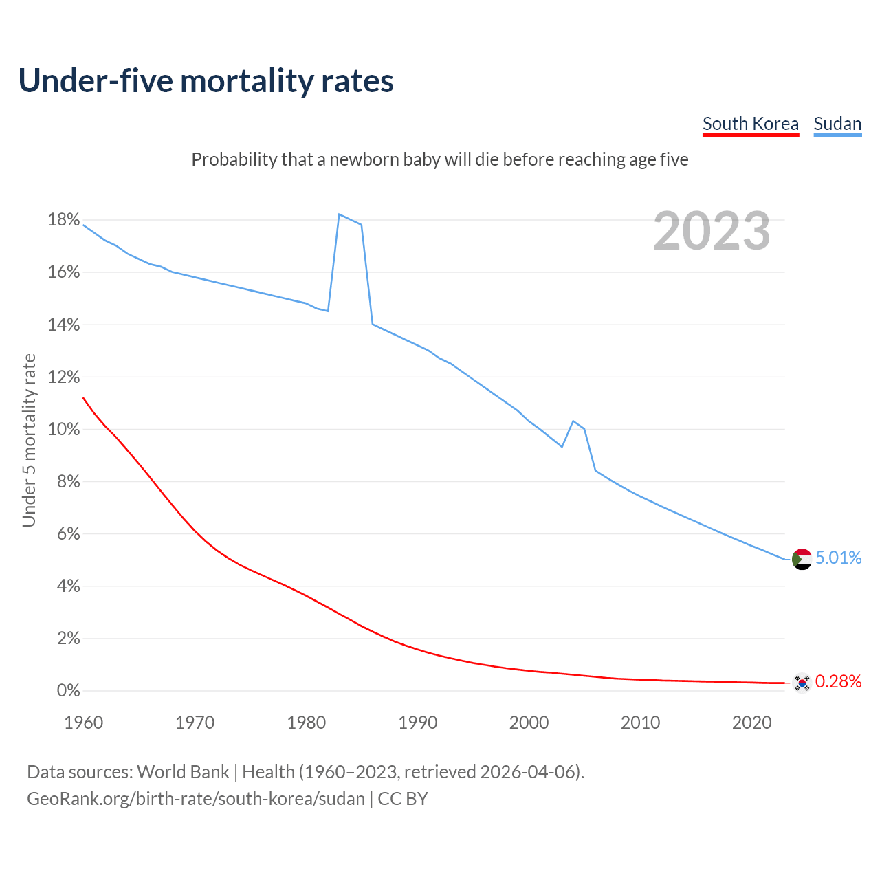 The chance that a newborn baby will die before reaching age five is 0.28% in South Korea and 5.01% in Sudan. Above is a chart with historical data on under-five mortality rates.