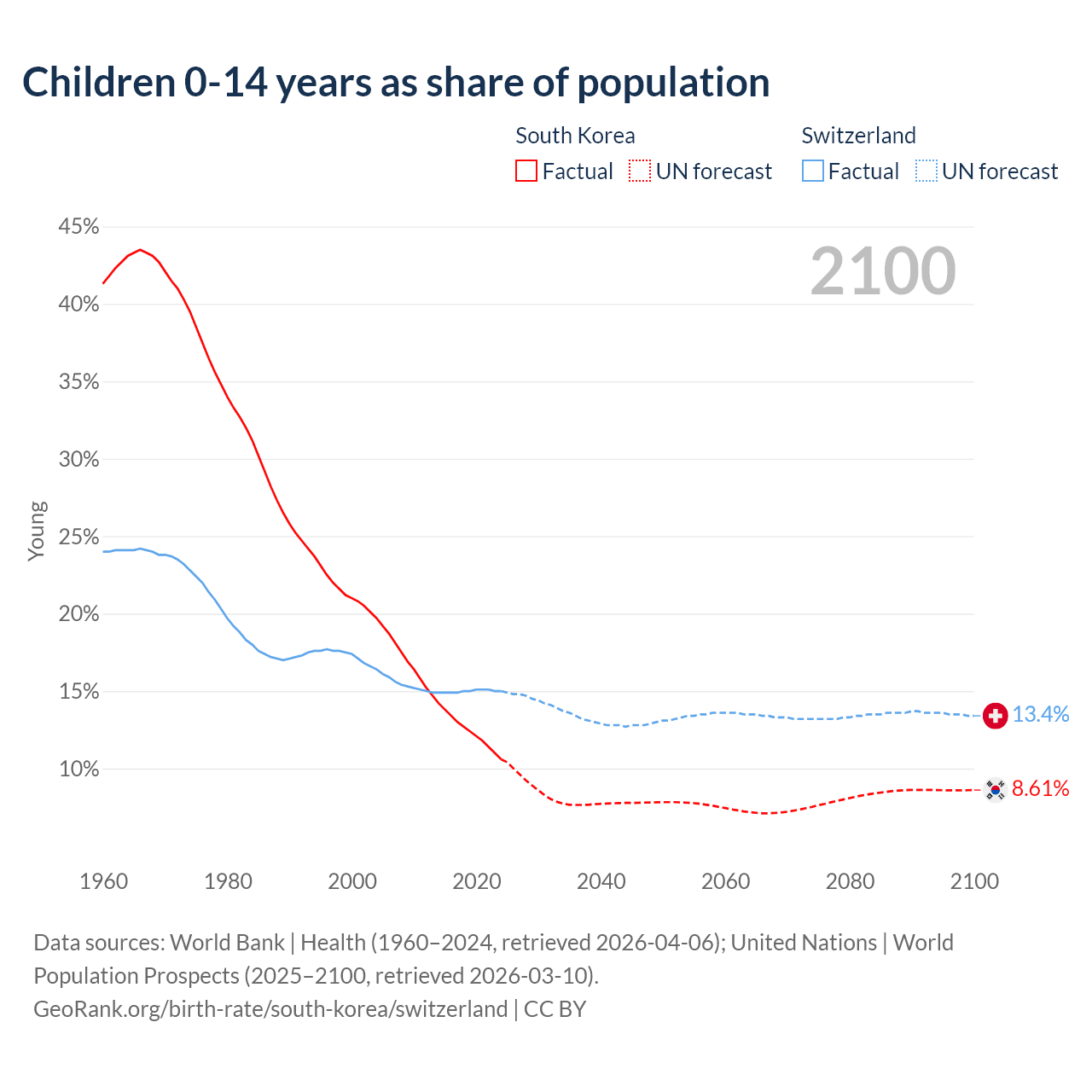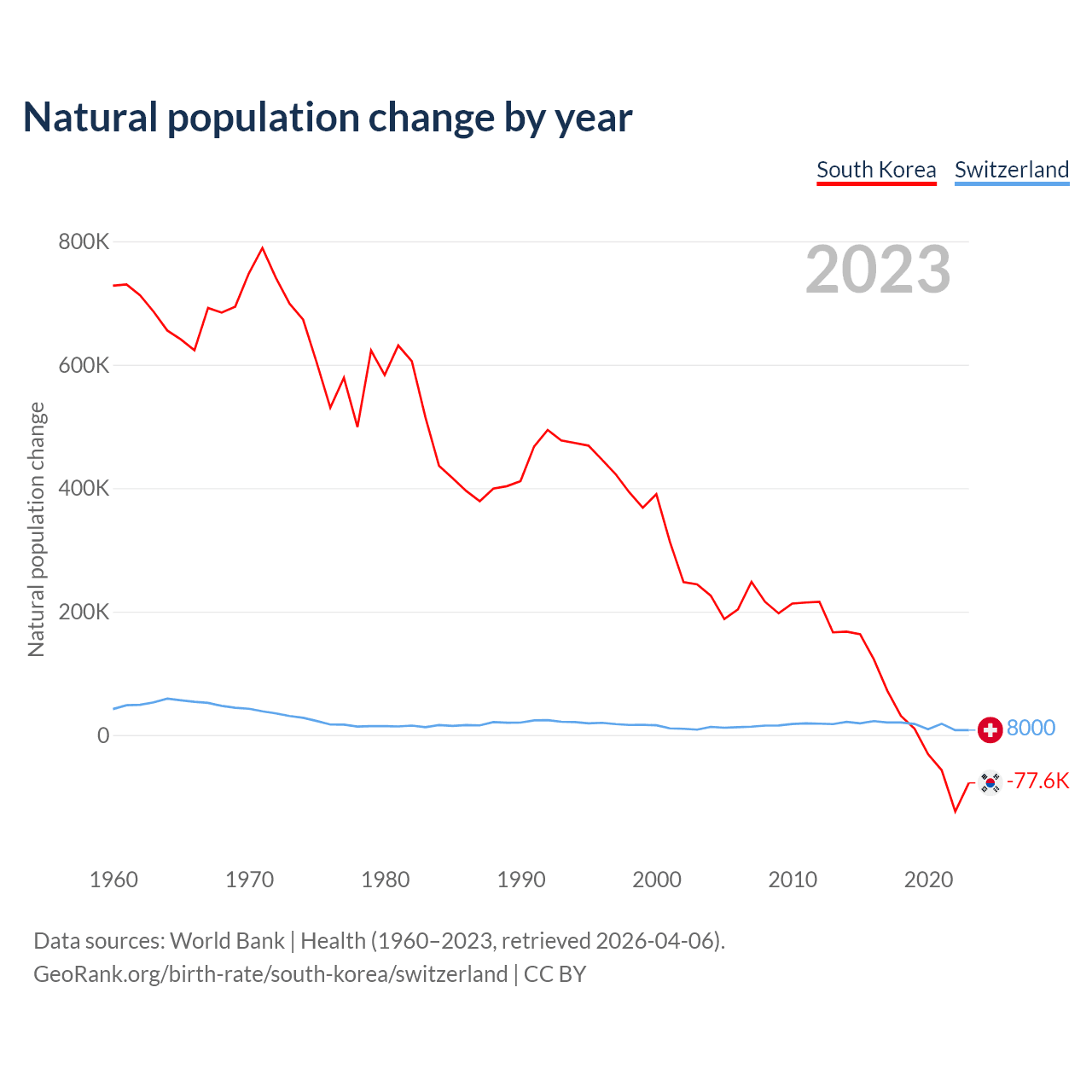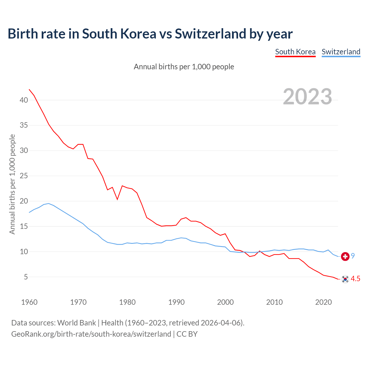 According to the latest available data on birth rates, the fertility rate in South Korea was 0.72 children per woman in 2023, compared to 1.33 in Switzerland in 2023. The replacement level is considered to be 2.1 children per woman.