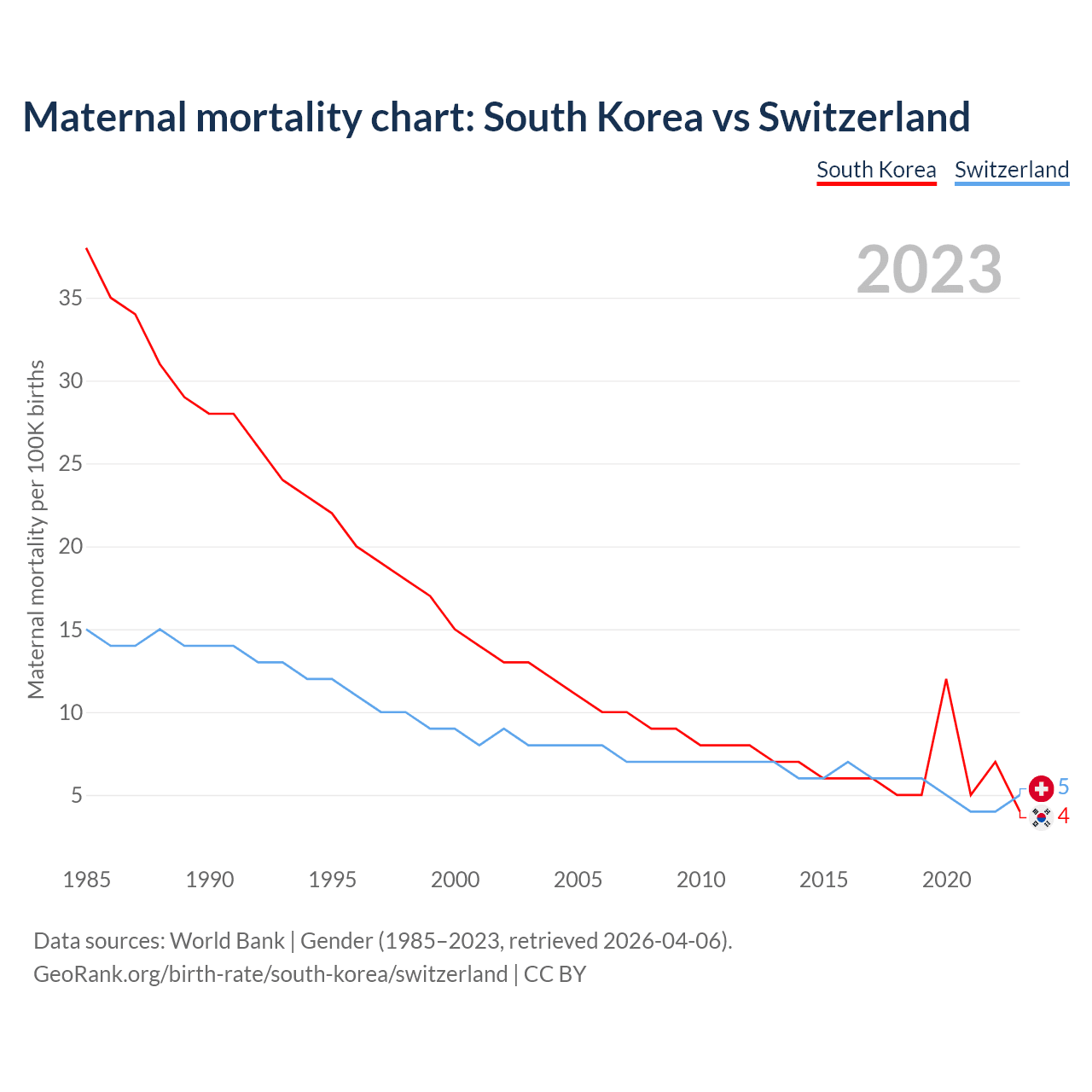 The maternal mortality rate, which is the probability of dying during childbirth or within 42 days of pregnancy termination, is 4 deaths per 100,000 live births in South Korea, compared to 5 deaths in Switzerland.