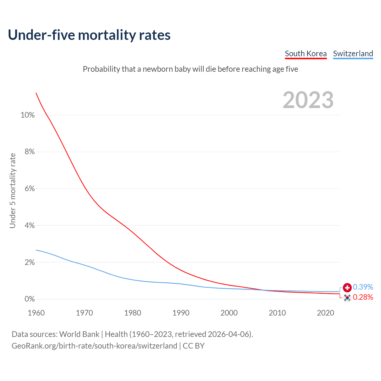 The chance that a newborn baby will die before reaching age five is 0.28% in South Korea and 0.39% in Switzerland. Above is a chart with historical data on under-five mortality rates.