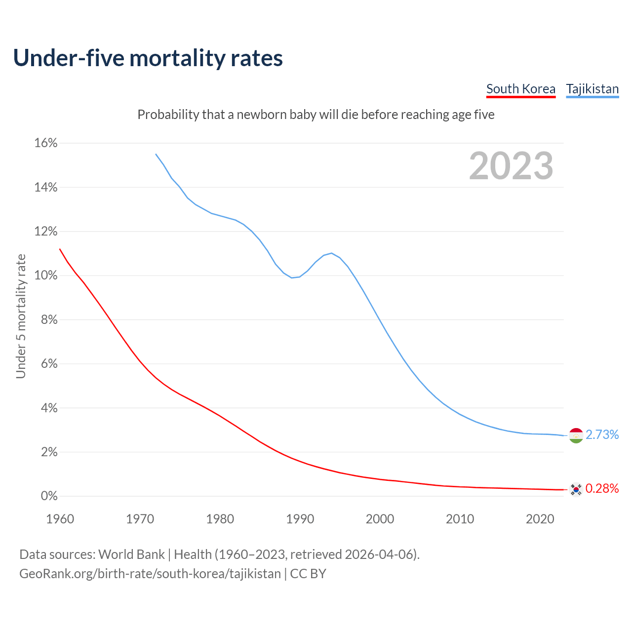 The chance that a newborn baby will die before reaching age five is 0.28% in South Korea and 2.73% in Tajikistan. Above is a chart with historical data on under-five mortality rates.