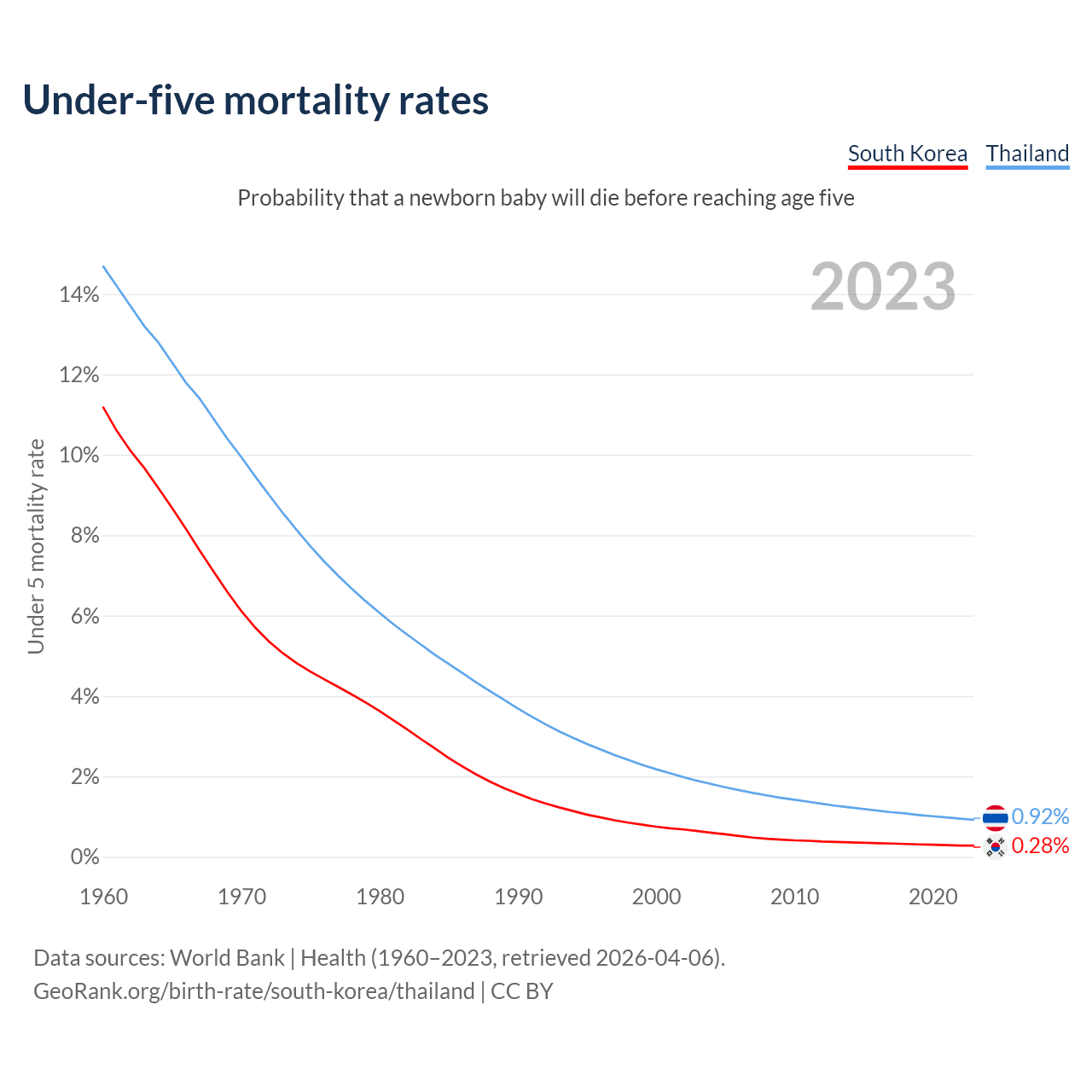 The chance that a newborn baby will die before reaching age five is 0.28% in South Korea and 0.92% in Thailand. Above is a chart with historical data on under-five mortality rates.
