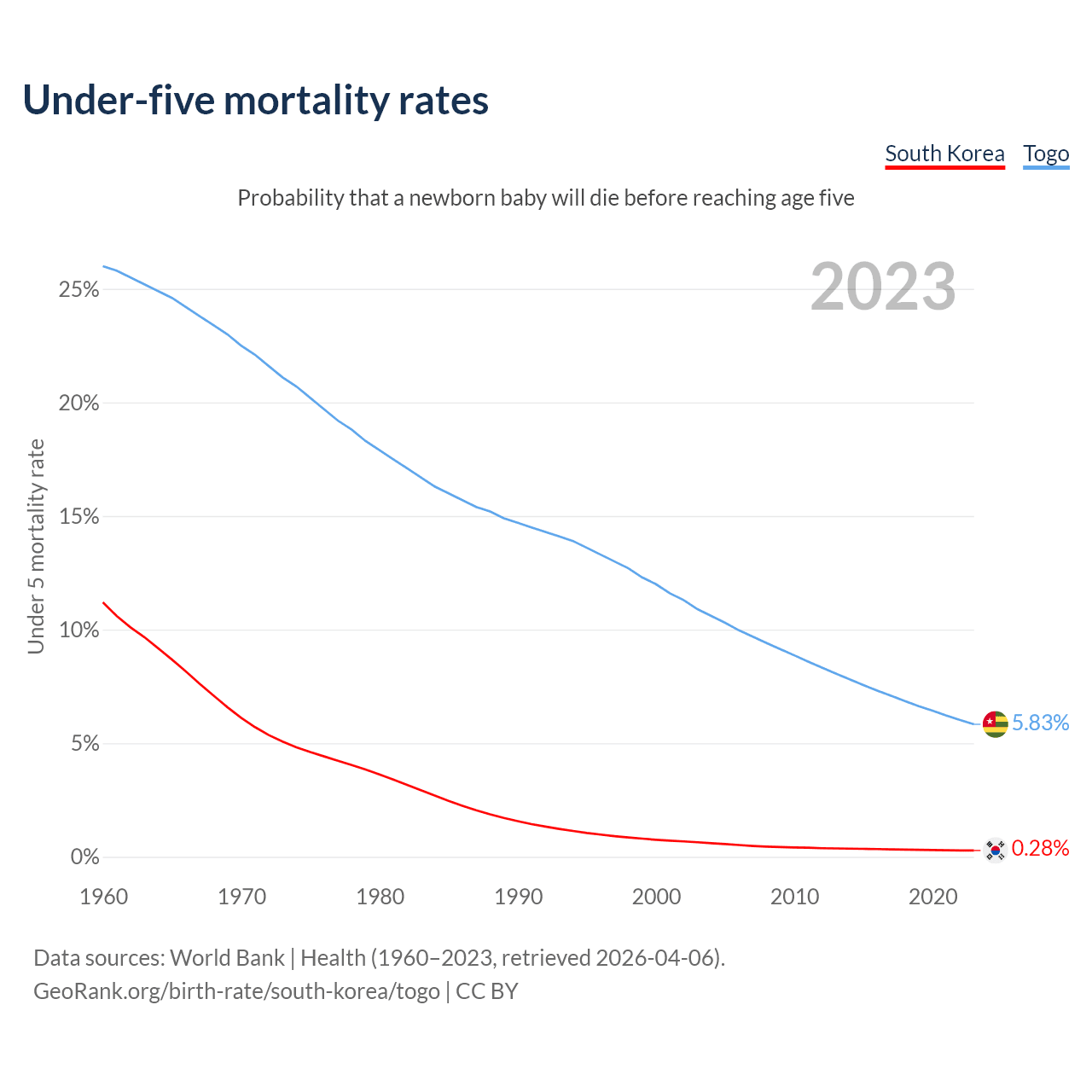 The chance that a newborn baby will die before reaching age five is 0.28% in South Korea and 5.83% in Togo. Above is a chart with historical data on under-five mortality rates.