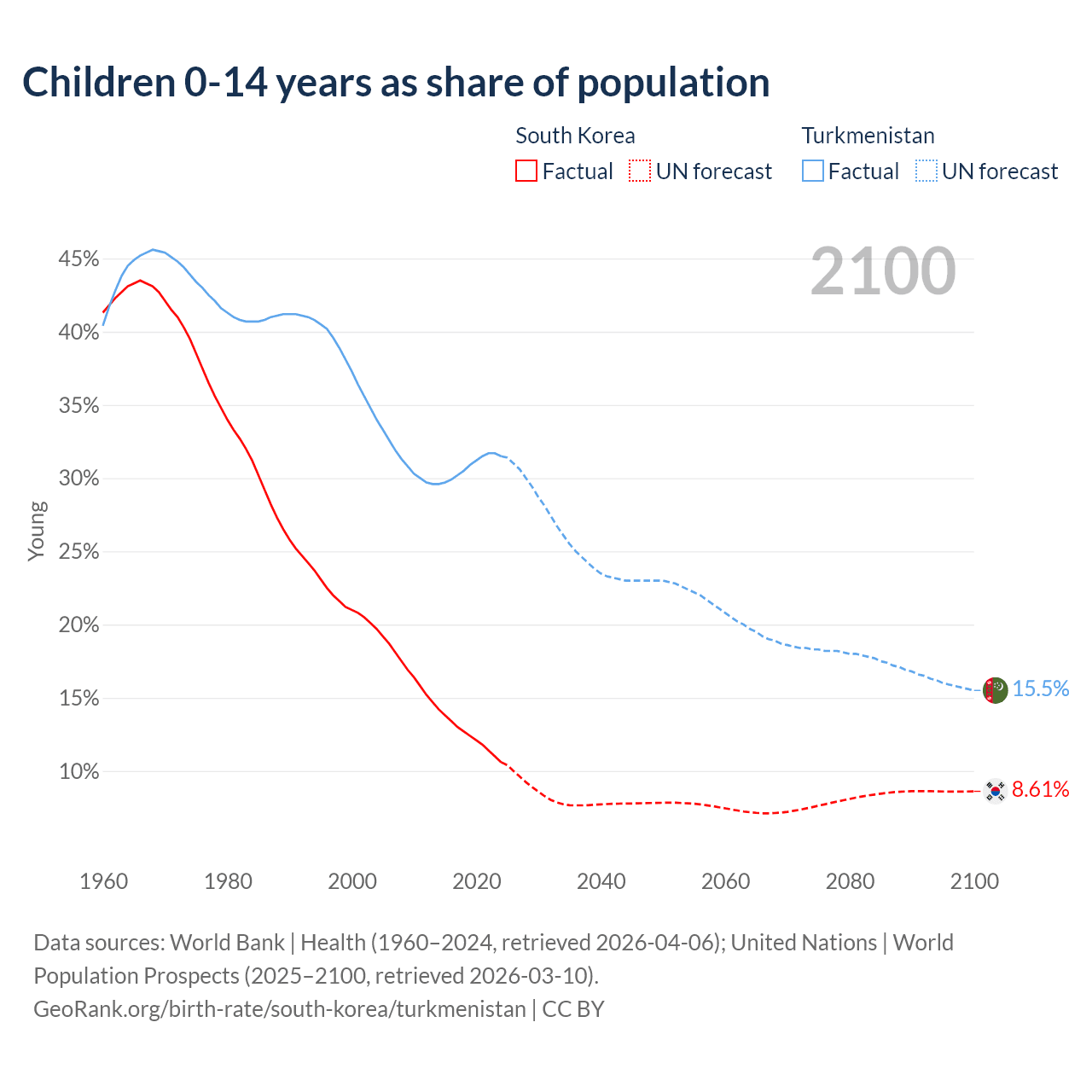 According to the latest available data on birth rates, the fertility rate in South Korea was 0.72 children per woman in 2023, compared to 2.69 in Turkmenistan in 2023. The replacement level is considered to be 2.1 children per woman.