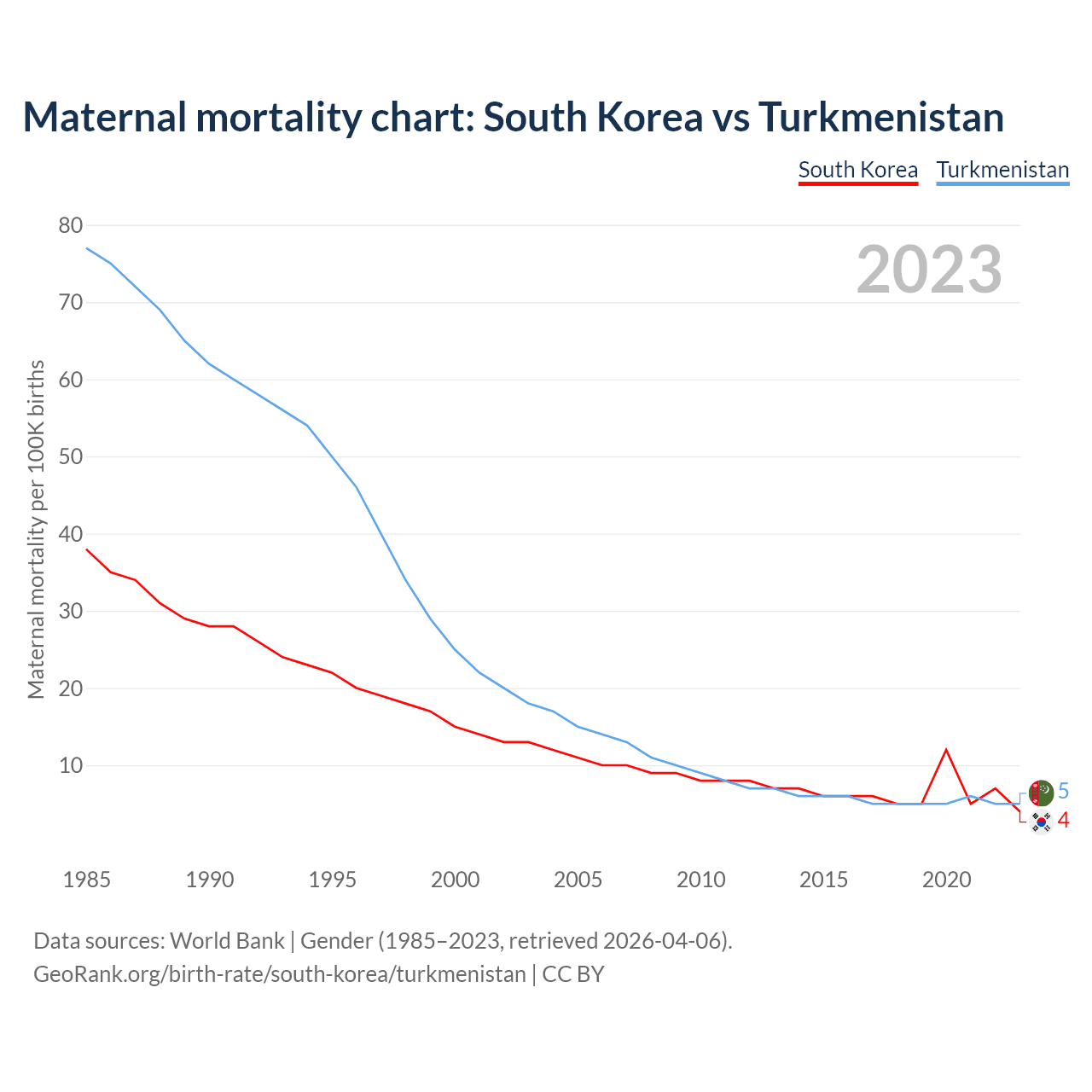 The maternal mortality rate, which is the probability of dying during childbirth or within 42 days of pregnancy termination, is 4 deaths per 100,000 live births in South Korea, compared to 5 deaths in Turkmenistan.