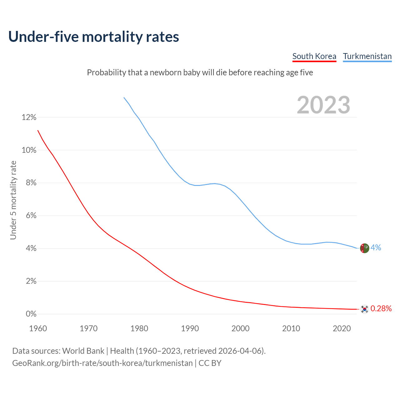 The chance that a newborn baby will die before reaching age five is 0.28% in South Korea and 4% in Turkmenistan. Above is a chart with historical data on under-five mortality rates.