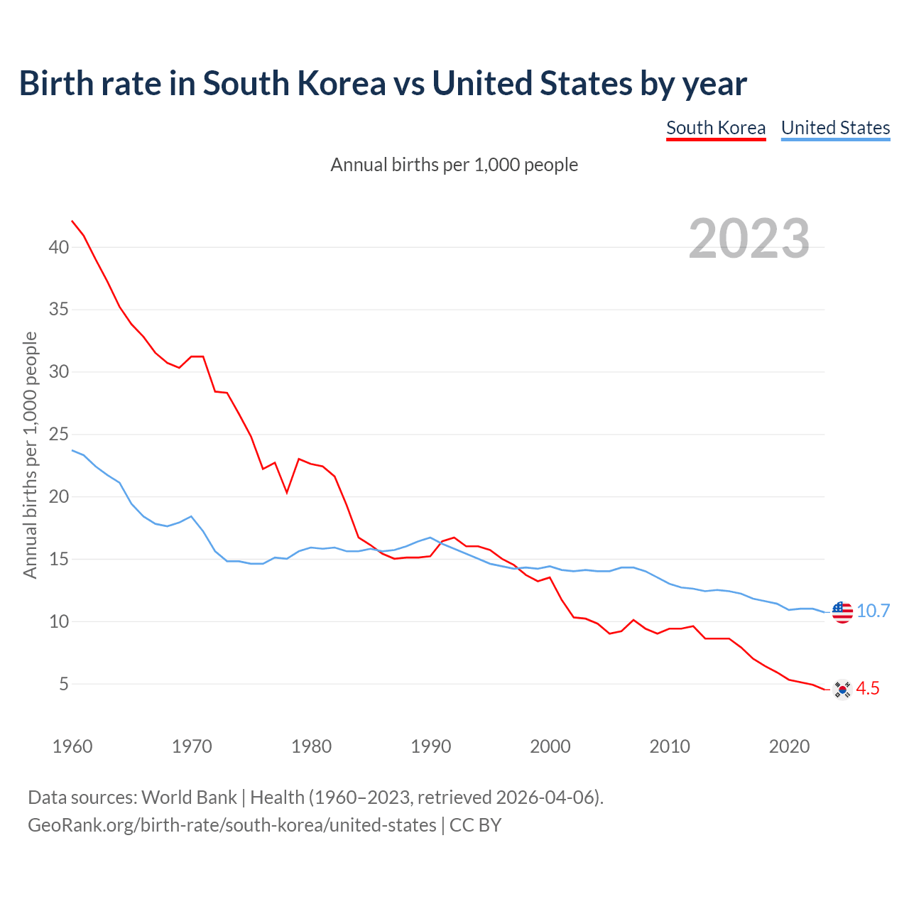 According to the latest available data on birth rates, the fertility rate in South Korea was 0.72 children per woman in 2023, compared to 1.62 in the United States in 2023. The replacement level is considered to be 2.1 children per woman.