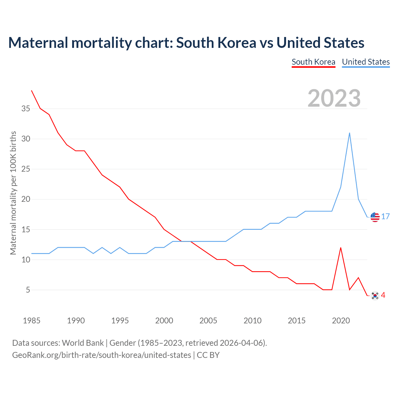 The maternal mortality rate, which is the probability of dying during childbirth or within 42 days of pregnancy termination, is 4 deaths per 100,000 live births in South Korea, compared to 17 deaths in the United States.