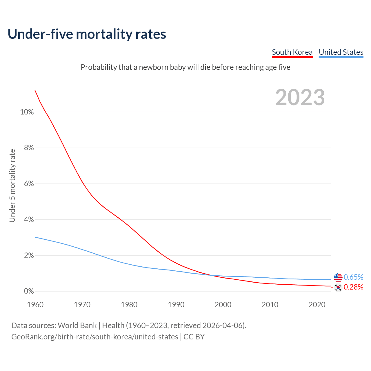 The chance that a newborn baby will die before reaching age five is 0.28% in South Korea and 0.65% in the United States. Above is a chart with historical data on under-five mortality rates.