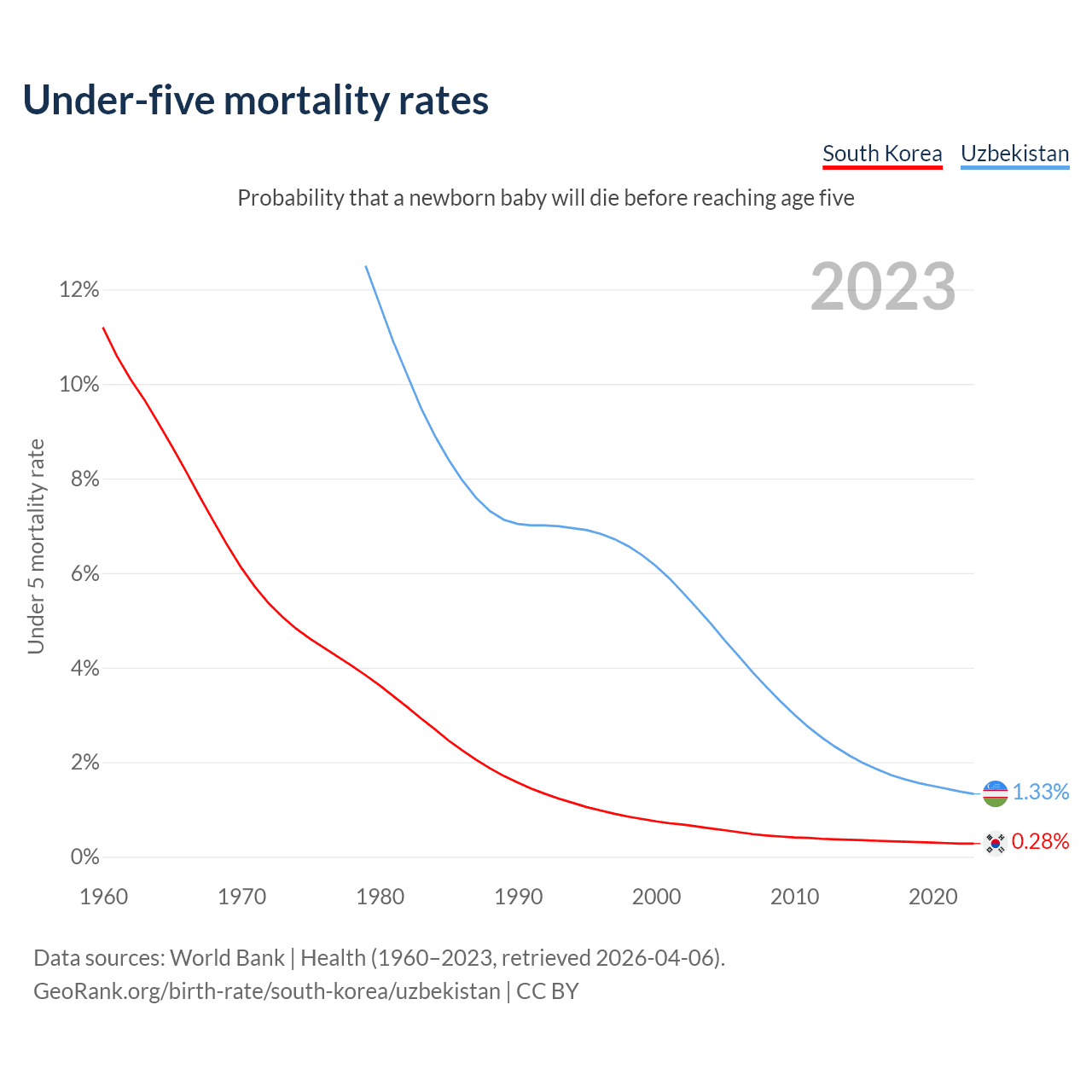 The chance that a newborn baby will die before reaching age five is 0.28% in South Korea and 1.33% in Uzbekistan. Above is a chart with historical data on under-five mortality rates.