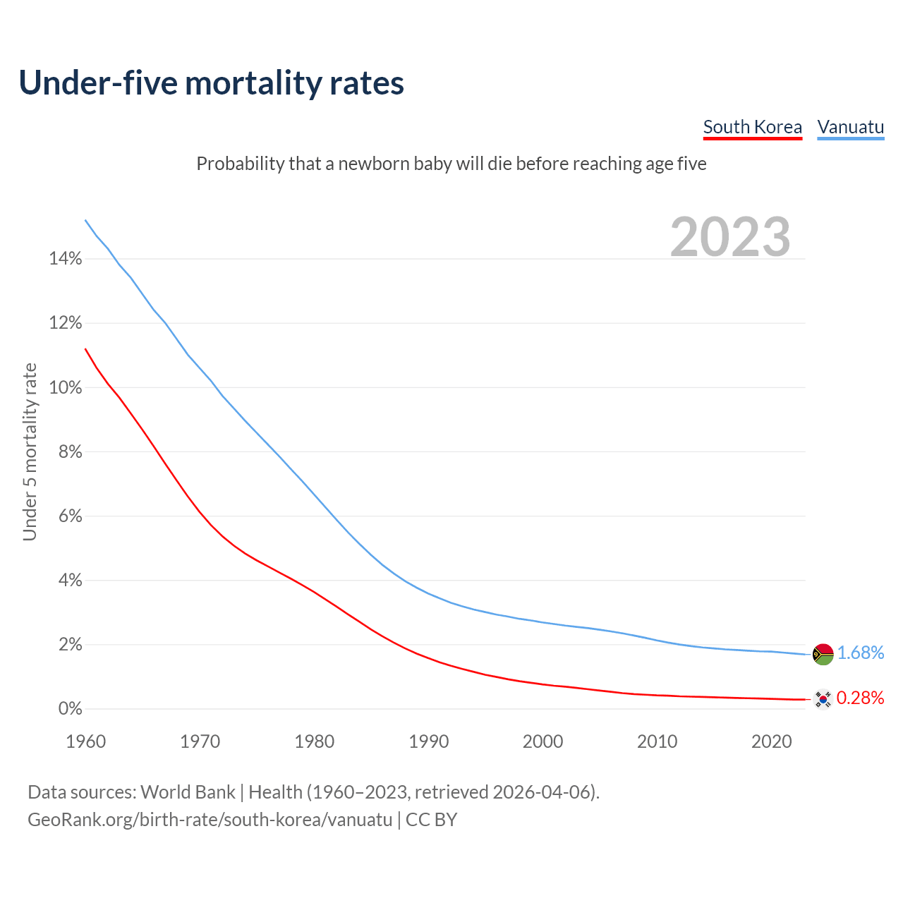 The chance that a newborn baby will die before reaching age five is 0.28% in South Korea and 1.68% in Vanuatu. Above is a chart with historical data on under-five mortality rates.